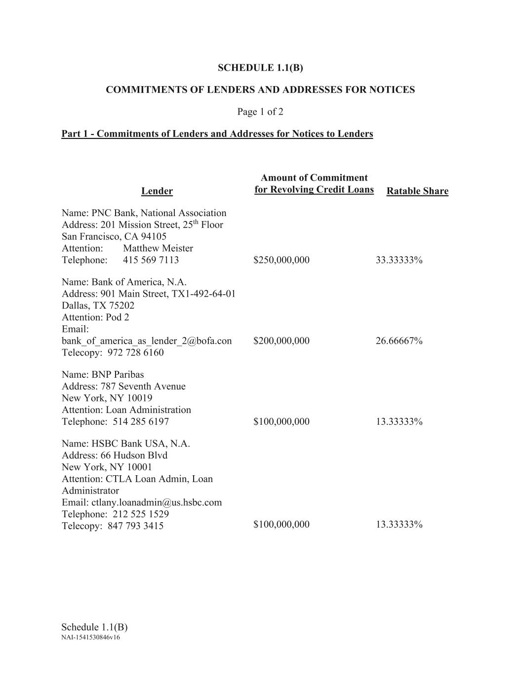 NAI-1541530846v16 Schedule 1.1(B) SCHEDULE 1.1(B) COMMITMENTS OF LENDERS AND ADDRESSES FOR NOTICES Page 1 of 2 Part 1 - Commitments of Lenders and Addresses for Notices to Lenders Lender Amount of Commitment for Revolving Credit Loans Ratable Share Name: PNC Bank, National Association Address: 201 Mission Street, 25th Floor San Francisco, CA 94105 Attention: Matthew Meister Telephone: 415 569 7113 $250,000,000 33.33333% Name: Bank of America, N.A. Address: 901 Main Street, TX1-492-64-01 Dallas, TX 75202 Attention: Pod 2 Email: bank_of_america_as_lender_2@bofa.con Telecopy: 972 728 6160 $200,000,000 26.66667% Name: BNP Paribas Address: 787 Seventh Avenue New York, NY 10019 Attention: Loan Administration Telephone: 514 285 6197 $100,000,000 13.33333% Name: HSBC Bank USA, N.A. Address: 66 Hudson Blvd New York, NY 10001 Attention: CTLA Loan Admin, Loan Administrator Email: ctlany.loanadmin@us.hsbc.com Telephone: 212 525 1529 Telecopy: 847 793 3415 $100,000,000 13.33333%