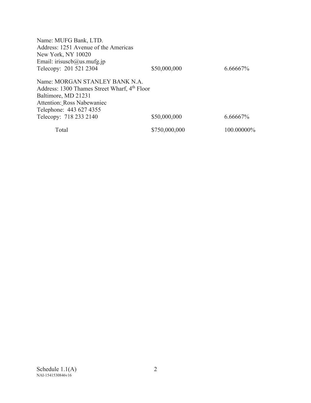 NAI-1541530846v16 Schedule 1.1(A) 2 Name: MUFG Bank, LTD. Address: 1251 Avenue of the Americas New York, NY 10020 Email: irisuscb@us.mufg.jp Telecopy: 201 521 2304 $50,000,000 6.66667% Name: MORGAN STANLEY BANK N.A. Address: 1300 Thames Street Wharf, 4th Floor Baltimore, MD 21231 Attention: Ross Nabewaniec Telephone: 443 627 4355 Telecopy: 718 233 2140 $50,000,000 6.66667% Total $750,000,000 100.00000%