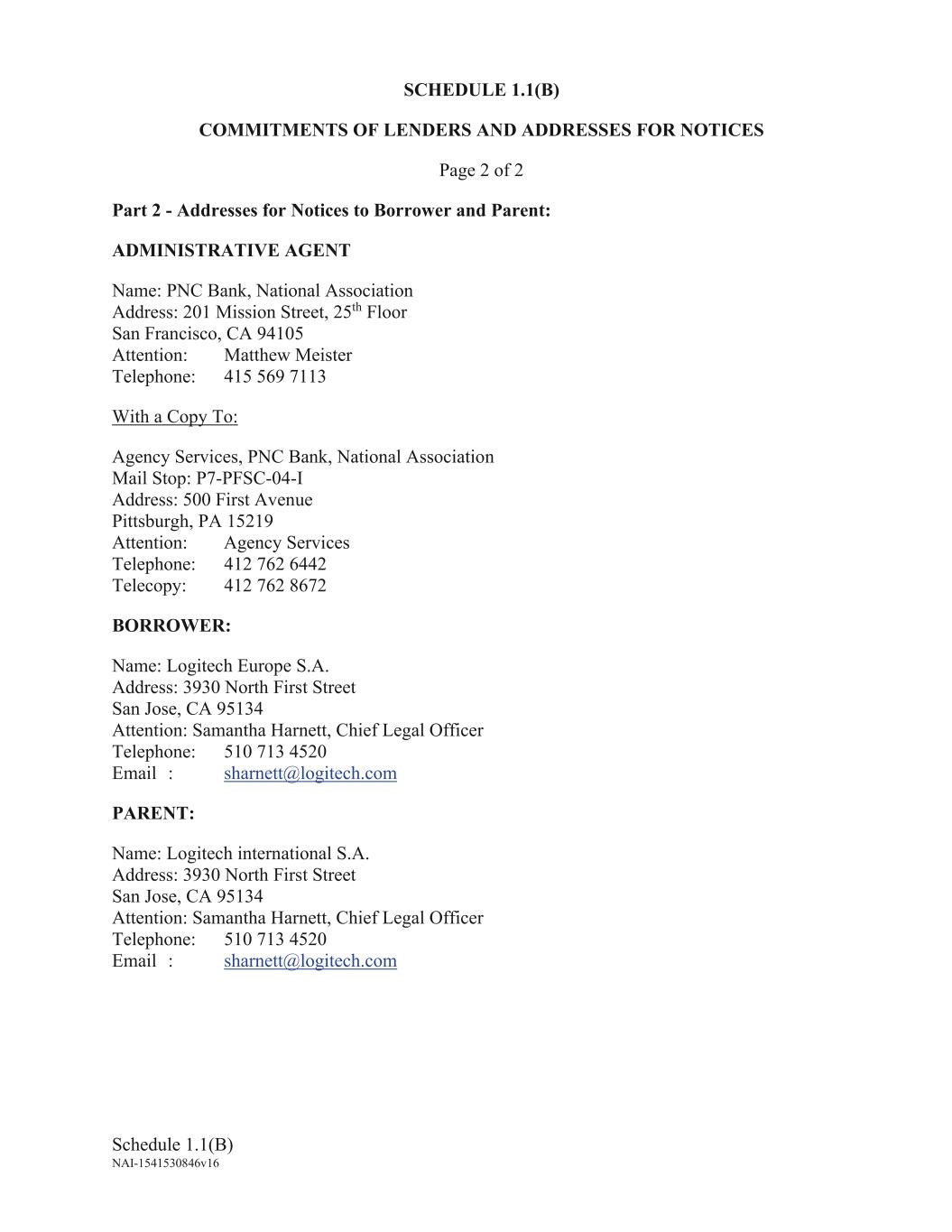 NAI-1541530846v16 Schedule 1.1(B) SCHEDULE 1.1(B) COMMITMENTS OF LENDERS AND ADDRESSES FOR NOTICES Page 2 of 2 Part 2 - Addresses for Notices to Borrower and Parent: ADMINISTRATIVE AGENT Name: PNC Bank, National Association Address: 201 Mission Street, 25th Floor San Francisco, CA 94105 Attention: Matthew Meister Telephone: 415 569 7113 With a Copy To: Agency Services, PNC Bank, National Association Mail Stop: P7-PFSC-04-I Address: 500 First Avenue Pittsburgh, PA 15219 Attention: Agency Services Telephone: 412 762 6442 Telecopy: 412 762 8672 BORROWER: Name: Logitech Europe S.A. Address: 3930 North First Street San Jose, CA 95134 Attention: Samantha Harnett, Chief Legal Officer Telephone: 510 713 4520 Email : sharnett@logitech.com PARENT: Name: Logitech international S.A. Address: 3930 North First Street San Jose, CA 95134 Attention: Samantha Harnett, Chief Legal Officer Telephone: 510 713 4520 Email : sharnett@logitech.com