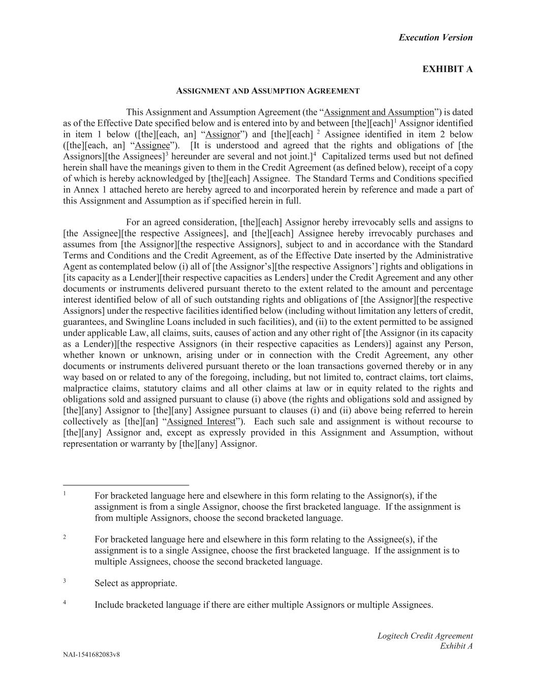 NAI-1541682083v8 Execution Version Logitech Credit Agreement Exhibit A EXHIBIT A ASSIGNMENT AND ASSUMPTION AGREEMENT This Assignment and Assumption Agreement (the “Assignment and Assumption”) is dated as of the Effective Date specified below and is entered into by and between [the][each]1 Assignor identified in item 1 below ([the][each, an] “Assignor”) and [the][each] 2 Assignee identified in item 2 below ([the][each, an] “Assignee”). [It is understood and agreed that the rights and obligations of [the Assignors][the Assignees]3 hereunder are several and not joint.]4 Capitalized terms used but not defined herein shall have the meanings given to them in the Credit Agreement (as defined below), receipt of a copy of which is hereby acknowledged by [the][each] Assignee. The Standard Terms and Conditions specified in Annex 1 attached hereto are hereby agreed to and incorporated herein by reference and made a part of this Assignment and Assumption as if specified herein in full. For an agreed consideration, [the][each] Assignor hereby irrevocably sells and assigns to [the Assignee][the respective Assignees], and [the][each] Assignee hereby irrevocably purchases and assumes from [the Assignor][the respective Assignors], subject to and in accordance with the Standard Terms and Conditions and the Credit Agreement, as of the Effective Date inserted by the Administrative Agent as contemplated below (i) all of [the Assignor’s][the respective Assignors’] rights and obligations in [its capacity as a Lender][their respective capacities as Lenders] under the Credit Agreement and any other documents or instruments delivered pursuant thereto to the extent related to the amount and percentage interest identified below of all of such outstanding rights and obligations of [the Assignor][the respective Assignors] under the respective facilities identified below (including without limitation any letters of credit, guarantees, and Swingline Loans included in such facilities), and (ii) to the extent permitted to be assigned under applicable Law, all claims, suits, causes of action and any other right of [the Assignor (in its capacity as a Lender)][the respective Assignors (in their respective capacities as Lenders)] against any Person, whether known or unknown, arising under or in connection with the Credit Agreement, any other documents or instruments delivered pursuant thereto or the loan transactions governed thereby or in any way based on or related to any of the foregoing, including, but not limited to, contract claims, tort claims, malpractice claims, statutory claims and all other claims at law or in equity related to the rights and obligations sold and assigned pursuant to clause (i) above (the rights and obligations sold and assigned by [the][any] Assignor to [the][any] Assignee pursuant to clauses (i) and (ii) above being referred to herein collectively as [the][an] “Assigned Interest”). Each such sale and assignment is without recourse to [the][any] Assignor and, except as expressly provided in this Assignment and Assumption, without representation or warranty by [the][any] Assignor. 1 For bracketed language here and elsewhere in this form relating to the Assignor(s), if the assignment is from a single Assignor, choose the first bracketed language. If the assignment is from multiple Assignors, choose the second bracketed language. 2 For bracketed language here and elsewhere in this form relating to the Assignee(s), if the assignment is to a single Assignee, choose the first bracketed language. If the assignment is to multiple Assignees, choose the second bracketed language. 3 Select as appropriate. 4 Include bracketed language if there are either multiple Assignors or multiple Assignees.