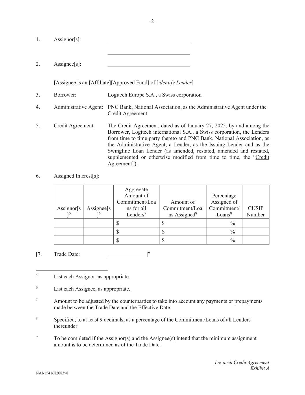 NAI-1541682083v8 -2- Logitech Credit Agreement Exhibit A 1. Assignor[s]: ______________________________ ______________________________ 2. Assignee[s]: ______________________________ ______________________________ [Assignee is an [Affiliate][Approved Fund] of [identify Lender] 3. Borrower: Logitech Europe S.A., a Swiss corporation 4. Administrative Agent: PNC Bank, National Association, as the Administrative Agent under the Credit Agreement 5. Credit Agreement: The Credit Agreement, dated as of January 27, 2025, by and among the Borrower, Logitech international S.A., a Swiss corporation, the Lenders from time to time party thereto and PNC Bank, National Association, as the Administrative Agent, a Lender, as the Issuing Lender and as the Swingline Loan Lender (as amended, restated, amended and restated, supplemented or otherwise modified from time to time, the “Credit Agreement”). 6. Assigned Interest[s]: Assignor[s ]5 Assignee[s ]6 Aggregate Amount of Commitment/Loa ns for all Lenders7 Amount of Commitment/Loa ns Assigned8 Percentage Assigned of Commitment/ Loans8 CUSIP Number $ $ % $ $ % $ $ % [7. Trade Date: ______________]9 5 List each Assignor, as appropriate. 6 List each Assignee, as appropriate. 7 Amount to be adjusted by the counterparties to take into account any payments or prepayments made between the Trade Date and the Effective Date. 8 Specified, to at least 9 decimals, as a percentage of the Commitment/Loans of all Lenders thereunder. 9 To be completed if the Assignor(s) and the Assignee(s) intend that the minimum assignment amount is to be determined as of the Trade Date.