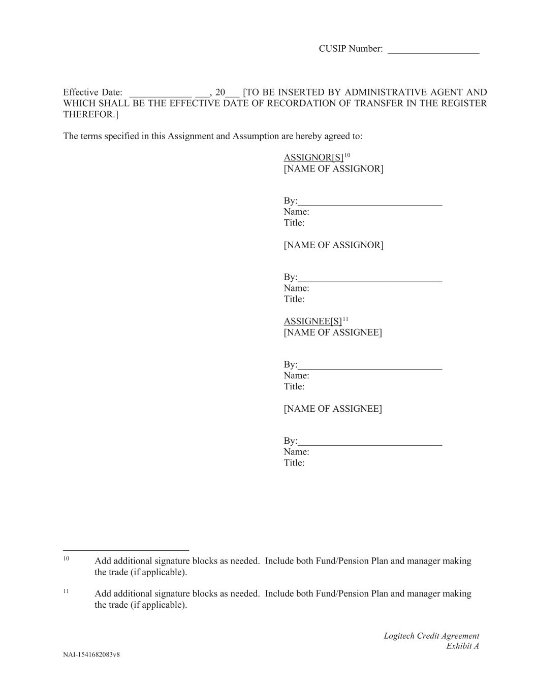 NAI-1541682083v8 CUSIP Number: ___________________ Logitech Credit Agreement Exhibit A Effective Date: _____________ ___, 20___ [TO BE INSERTED BY ADMINISTRATIVE AGENT AND WHICH SHALL BE THE EFFECTIVE DATE OF RECORDATION OF TRANSFER IN THE REGISTER THEREFOR.] The terms specified in this Assignment and Assumption are hereby agreed to: ASSIGNOR[S]10 [NAME OF ASSIGNOR] By:______________________________ Name: Title: [NAME OF ASSIGNOR] By:______________________________ Name: Title: ASSIGNEE[S]11 [NAME OF ASSIGNEE] By:______________________________ Name: Title: [NAME OF ASSIGNEE] By:______________________________ Name: Title: 10 Add additional signature blocks as needed. Include both Fund/Pension Plan and manager making the trade (if applicable). 11 Add additional signature blocks as needed. Include both Fund/Pension Plan and manager making the trade (if applicable).