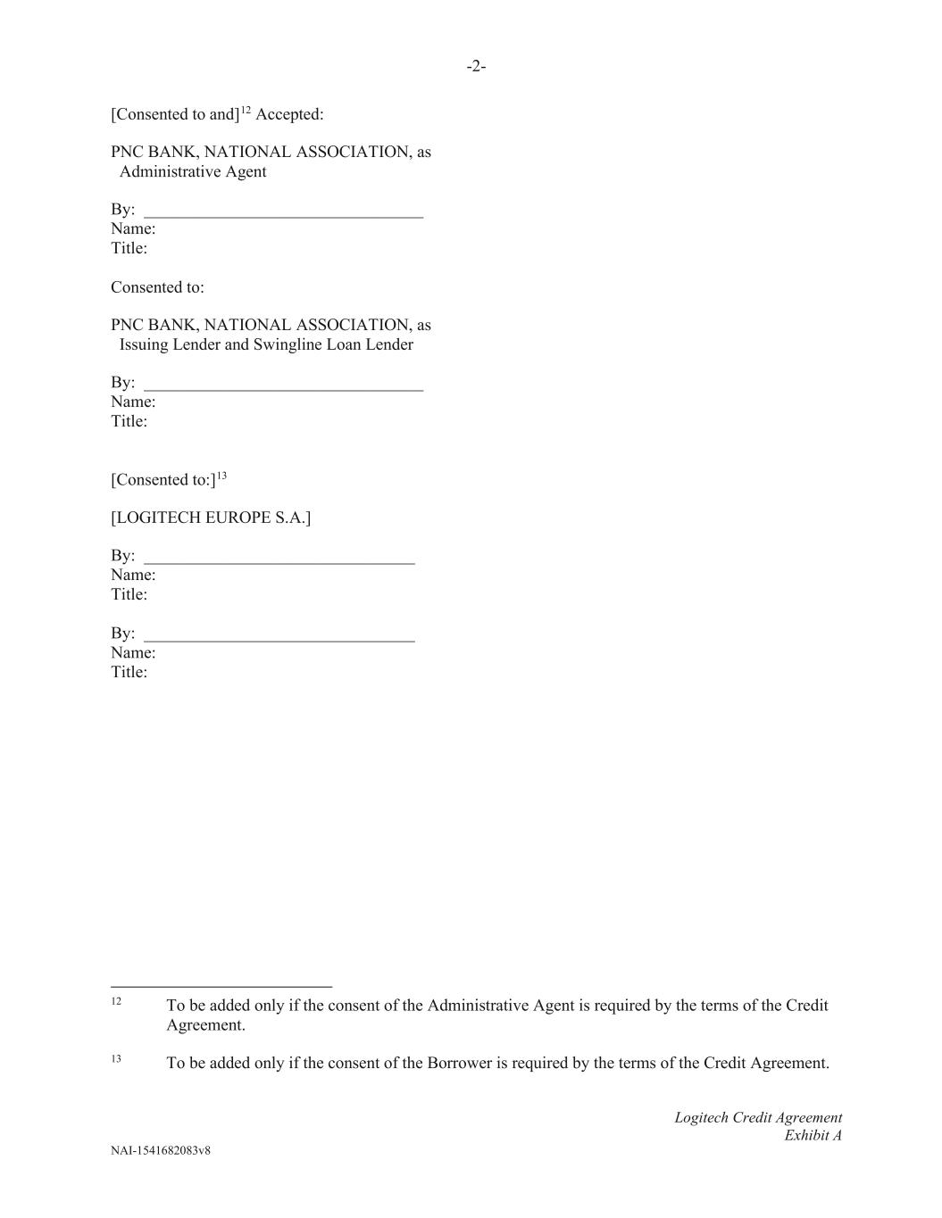 NAI-1541682083v8 -2- Logitech Credit Agreement Exhibit A [Consented to and]12 Accepted: PNC BANK, NATIONAL ASSOCIATION, as Administrative Agent By: _________________________________ Name: Title: Consented to: PNC BANK, NATIONAL ASSOCIATION, as Issuing Lender and Swingline Loan Lender By: _________________________________ Name: Title: [Consented to:]13 [LOGITECH EUROPE S.A.] By: ________________________________ Name: Title: By: ________________________________ Name: Title: 12 To be added only if the consent of the Administrative Agent is required by the terms of the Credit Agreement. 13 To be added only if the consent of the Borrower is required by the terms of the Credit Agreement.