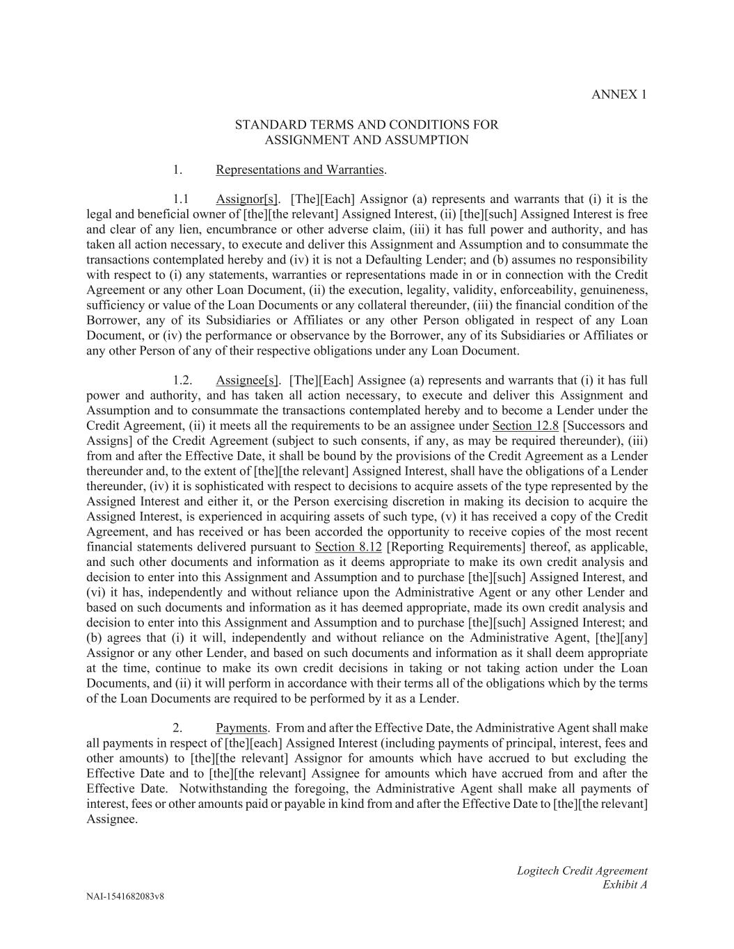 NAI-1541682083v8 Logitech Credit Agreement Exhibit A ANNEX 1 STANDARD TERMS AND CONDITIONS FOR ASSIGNMENT AND ASSUMPTION 1. Representations and Warranties. 1.1 Assignor[s]. [The][Each] Assignor (a) represents and warrants that (i) it is the legal and beneficial owner of [the][the relevant] Assigned Interest, (ii) [the][such] Assigned Interest is free and clear of any lien, encumbrance or other adverse claim, (iii) it has full power and authority, and has taken all action necessary, to execute and deliver this Assignment and Assumption and to consummate the transactions contemplated hereby and (iv) it is not a Defaulting Lender; and (b) assumes no responsibility with respect to (i) any statements, warranties or representations made in or in connection with the Credit Agreement or any other Loan Document, (ii) the execution, legality, validity, enforceability, genuineness, sufficiency or value of the Loan Documents or any collateral thereunder, (iii) the financial condition of the Borrower, any of its Subsidiaries or Affiliates or any other Person obligated in respect of any Loan Document, or (iv) the performance or observance by the Borrower, any of its Subsidiaries or Affiliates or any other Person of any of their respective obligations under any Loan Document. 1.2. Assignee[s]. [The][Each] Assignee (a) represents and warrants that (i) it has full power and authority, and has taken all action necessary, to execute and deliver this Assignment and Assumption and to consummate the transactions contemplated hereby and to become a Lender under the Credit Agreement, (ii) it meets all the requirements to be an assignee under Section 12.8 [Successors and Assigns] of the Credit Agreement (subject to such consents, if any, as may be required thereunder), (iii) from and after the Effective Date, it shall be bound by the provisions of the Credit Agreement as a Lender thereunder and, to the extent of [the][the relevant] Assigned Interest, shall have the obligations of a Lender thereunder, (iv) it is sophisticated with respect to decisions to acquire assets of the type represented by the Assigned Interest and either it, or the Person exercising discretion in making its decision to acquire the Assigned Interest, is experienced in acquiring assets of such type, (v) it has received a copy of the Credit Agreement, and has received or has been accorded the opportunity to receive copies of the most recent financial statements delivered pursuant to Section 8.12 [Reporting Requirements] thereof, as applicable, and such other documents and information as it deems appropriate to make its own credit analysis and decision to enter into this Assignment and Assumption and to purchase [the][such] Assigned Interest, and (vi) it has, independently and without reliance upon the Administrative Agent or any other Lender and based on such documents and information as it has deemed appropriate, made its own credit analysis and decision to enter into this Assignment and Assumption and to purchase [the][such] Assigned Interest; and (b) agrees that (i) it will, independently and without reliance on the Administrative Agent, [the][any] Assignor or any other Lender, and based on such documents and information as it shall deem appropriate at the time, continue to make its own credit decisions in taking or not taking action under the Loan Documents, and (ii) it will perform in accordance with their terms all of the obligations which by the terms of the Loan Documents are required to be performed by it as a Lender. 2. Payments. From and after the Effective Date, the Administrative Agent shall make all payments in respect of [the][each] Assigned Interest (including payments of principal, interest, fees and other amounts) to [the][the relevant] Assignor for amounts which have accrued to but excluding the Effective Date and to [the][the relevant] Assignee for amounts which have accrued from and after the Effective Date. Notwithstanding the foregoing, the Administrative Agent shall make all payments of interest, fees or other amounts paid or payable in kind from and after the Effective Date to [the][the relevant] Assignee.
