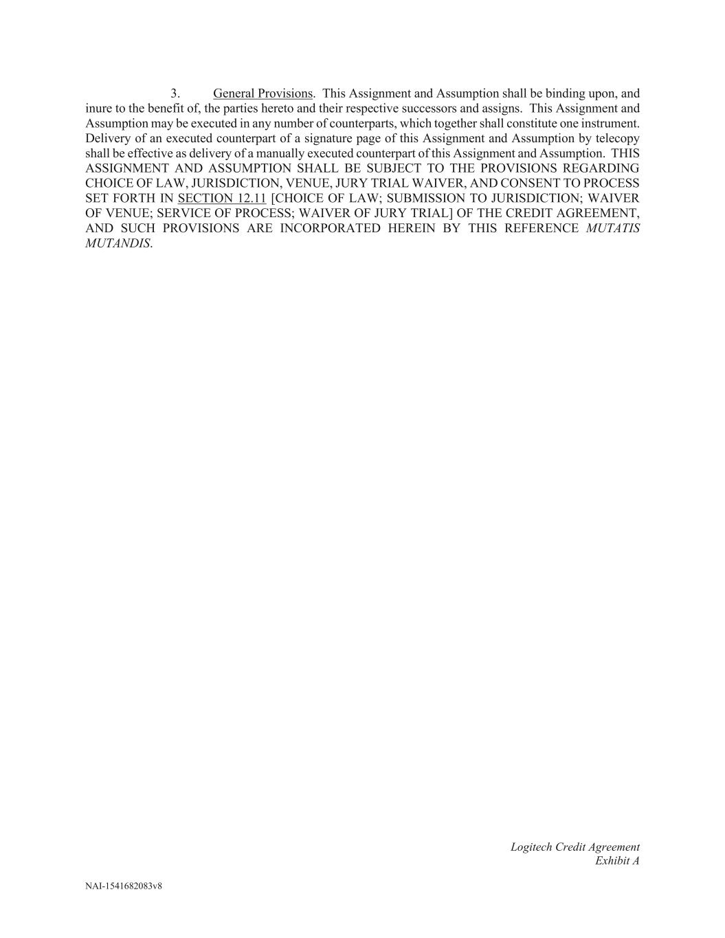 NAI-1541682083v8 Logitech Credit Agreement Exhibit A 3. General Provisions. This Assignment and Assumption shall be binding upon, and inure to the benefit of, the parties hereto and their respective successors and assigns. This Assignment and Assumption may be executed in any number of counterparts, which together shall constitute one instrument. Delivery of an executed counterpart of a signature page of this Assignment and Assumption by telecopy shall be effective as delivery of a manually executed counterpart of this Assignment and Assumption. THIS ASSIGNMENT AND ASSUMPTION SHALL BE SUBJECT TO THE PROVISIONS REGARDING CHOICE OF LAW, JURISDICTION, VENUE, JURY TRIAL WAIVER, AND CONSENT TO PROCESS SET FORTH IN SECTION 12.11 [CHOICE OF LAW; SUBMISSION TO JURISDICTION; WAIVER OF VENUE; SERVICE OF PROCESS; WAIVER OF JURY TRIAL] OF THE CREDIT AGREEMENT, AND SUCH PROVISIONS ARE INCORPORATED HEREIN BY THIS REFERENCE MUTATIS MUTANDIS.
