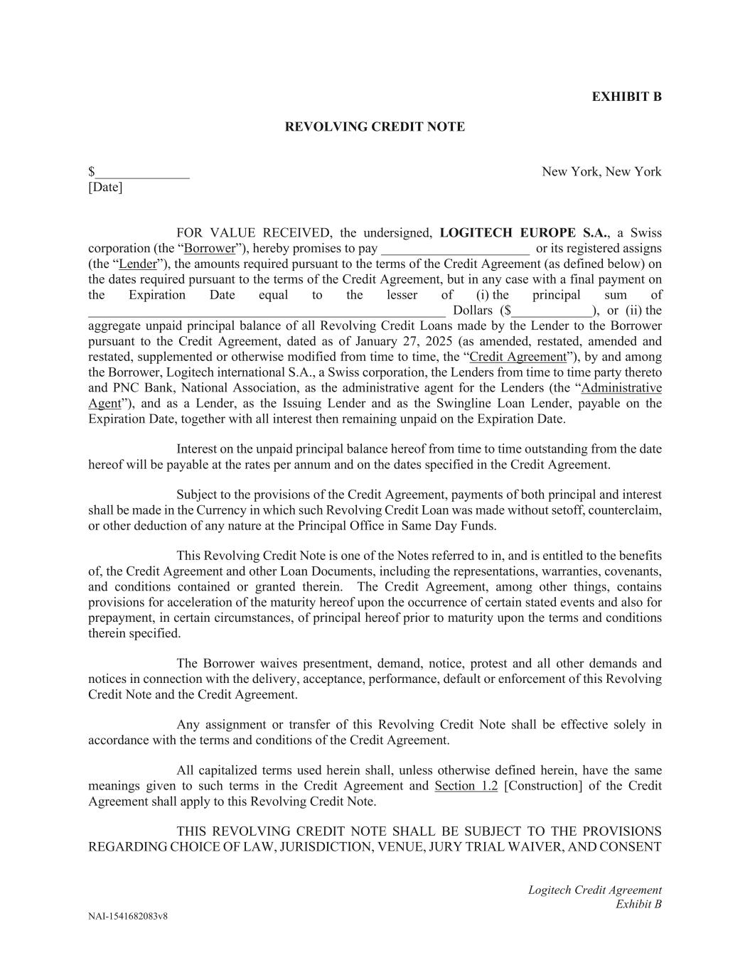 NAI-1541682083v8 Logitech Credit Agreement Exhibit B EXHIBIT B REVOLVING CREDIT NOTE $______________ New York, New York [Date] FOR VALUE RECEIVED, the undersigned, LOGITECH EUROPE S.A., a Swiss corporation (the “Borrower”), hereby promises to pay ______________________ or its registered assigns (the “Lender”), the amounts required pursuant to the terms of the Credit Agreement (as defined below) on the dates required pursuant to the terms of the Credit Agreement, but in any case with a final payment on the Expiration Date equal to the lesser of (i) the principal sum of _____________________________________________________ Dollars ($____________), or (ii) the aggregate unpaid principal balance of all Revolving Credit Loans made by the Lender to the Borrower pursuant to the Credit Agreement, dated as of January 27, 2025 (as amended, restated, amended and restated, supplemented or otherwise modified from time to time, the “Credit Agreement”), by and among the Borrower, Logitech international S.A., a Swiss corporation, the Lenders from time to time party thereto and PNC Bank, National Association, as the administrative agent for the Lenders (the “Administrative Agent”), and as a Lender, as the Issuing Lender and as the Swingline Loan Lender, payable on the Expiration Date, together with all interest then remaining unpaid on the Expiration Date. Interest on the unpaid principal balance hereof from time to time outstanding from the date hereof will be payable at the rates per annum and on the dates specified in the Credit Agreement. Subject to the provisions of the Credit Agreement, payments of both principal and interest shall be made in the Currency in which such Revolving Credit Loan was made without setoff, counterclaim, or other deduction of any nature at the Principal Office in Same Day Funds. This Revolving Credit Note is one of the Notes referred to in, and is entitled to the benefits of, the Credit Agreement and other Loan Documents, including the representations, warranties, covenants, and conditions contained or granted therein. The Credit Agreement, among other things, contains provisions for acceleration of the maturity hereof upon the occurrence of certain stated events and also for prepayment, in certain circumstances, of principal hereof prior to maturity upon the terms and conditions therein specified. The Borrower waives presentment, demand, notice, protest and all other demands and notices in connection with the delivery, acceptance, performance, default or enforcement of this Revolving Credit Note and the Credit Agreement. Any assignment or transfer of this Revolving Credit Note shall be effective solely in accordance with the terms and conditions of the Credit Agreement. All capitalized terms used herein shall, unless otherwise defined herein, have the same meanings given to such terms in the Credit Agreement and Section 1.2 [Construction] of the Credit Agreement shall apply to this Revolving Credit Note. THIS REVOLVING CREDIT NOTE SHALL BE SUBJECT TO THE PROVISIONS REGARDING CHOICE OF LAW, JURISDICTION, VENUE, JURY TRIAL WAIVER, AND CONSENT