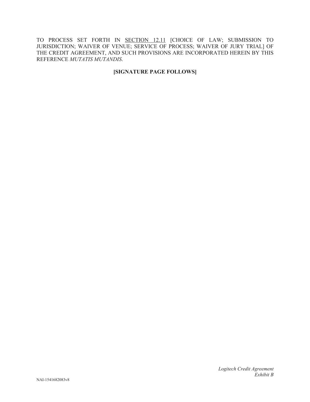 NAI-1541682083v8 Logitech Credit Agreement Exhibit B TO PROCESS SET FORTH IN SECTION 12.11 [CHOICE OF LAW; SUBMISSION TO JURISDICTION; WAIVER OF VENUE; SERVICE OF PROCESS; WAIVER OF JURY TRIAL] OF THE CREDIT AGREEMENT, AND SUCH PROVISIONS ARE INCORPORATED HEREIN BY THIS REFERENCE MUTATIS MUTANDIS. [SIGNATURE PAGE FOLLOWS]