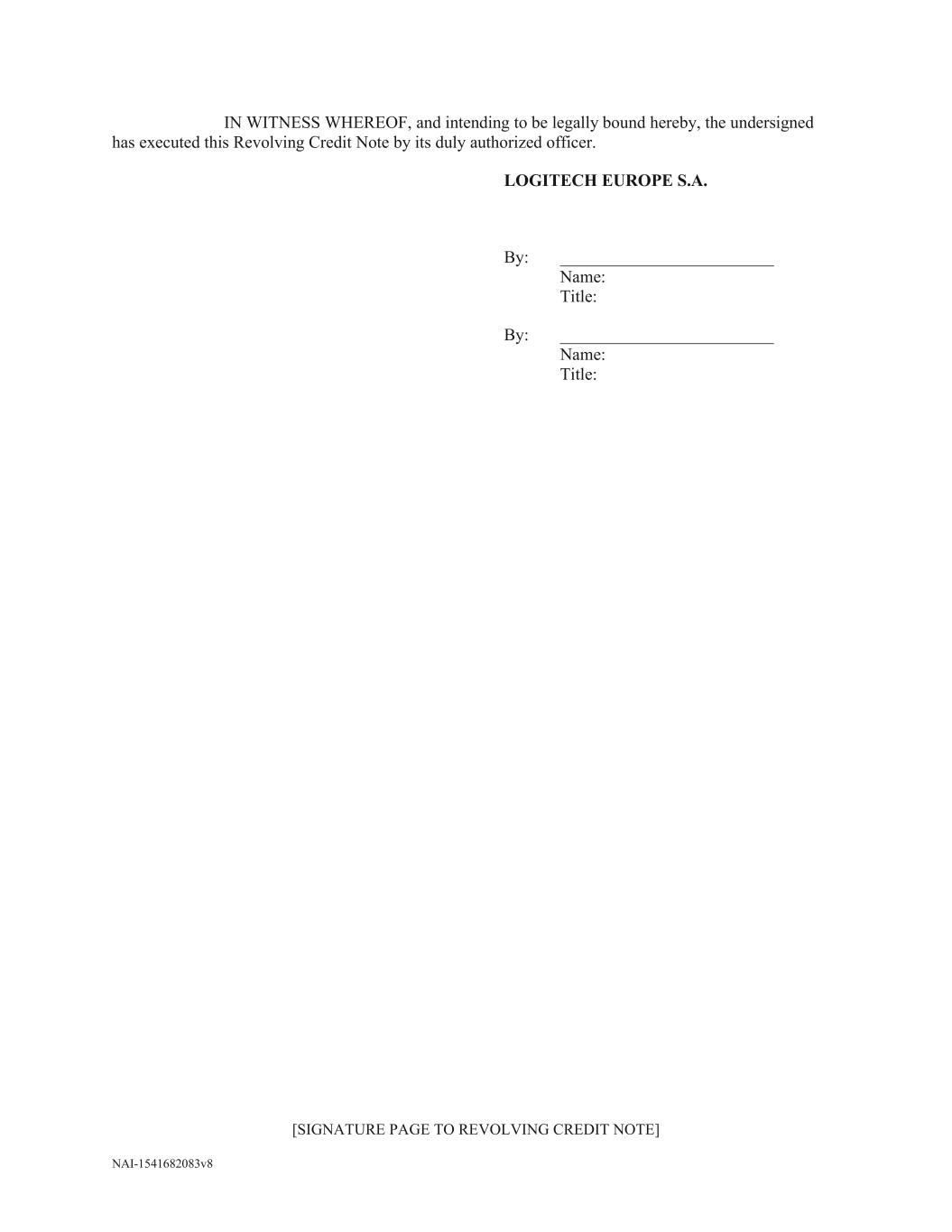 NAI-1541682083v8 [SIGNATURE PAGE TO REVOLVING CREDIT NOTE] IN WITNESS WHEREOF, and intending to be legally bound hereby, the undersigned has executed this Revolving Credit Note by its duly authorized officer. LOGITECH EUROPE S.A. By: _________________________ Name: Title: By: _________________________ Name: Title:
