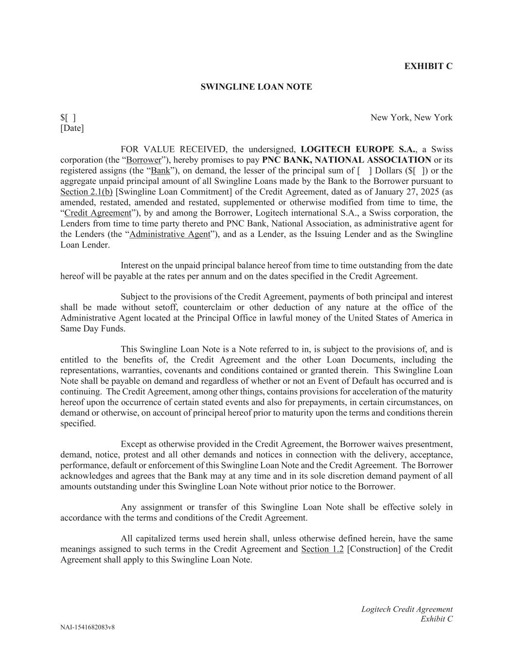 NAI-1541682083v8 Logitech Credit Agreement Exhibit C EXHIBIT C SWINGLINE LOAN NOTE $[ ] New York, New York [Date] FOR VALUE RECEIVED, the undersigned, LOGITECH EUROPE S.A., a Swiss corporation (the “Borrower”), hereby promises to pay PNC BANK, NATIONAL ASSOCIATION or its registered assigns (the “Bank”), on demand, the lesser of the principal sum of [ ] Dollars ($[ ]) or the aggregate unpaid principal amount of all Swingline Loans made by the Bank to the Borrower pursuant to Section 2.1(b) [Swingline Loan Commitment] of the Credit Agreement, dated as of January 27, 2025 (as amended, restated, amended and restated, supplemented or otherwise modified from time to time, the “Credit Agreement”), by and among the Borrower, Logitech international S.A., a Swiss corporation, the Lenders from time to time party thereto and PNC Bank, National Association, as administrative agent for the Lenders (the “Administrative Agent”), and as a Lender, as the Issuing Lender and as the Swingline Loan Lender. Interest on the unpaid principal balance hereof from time to time outstanding from the date hereof will be payable at the rates per annum and on the dates specified in the Credit Agreement. Subject to the provisions of the Credit Agreement, payments of both principal and interest shall be made without setoff, counterclaim or other deduction of any nature at the office of the Administrative Agent located at the Principal Office in lawful money of the United States of America in Same Day Funds. This Swingline Loan Note is a Note referred to in, is subject to the provisions of, and is entitled to the benefits of, the Credit Agreement and the other Loan Documents, including the representations, warranties, covenants and conditions contained or granted therein. This Swingline Loan Note shall be payable on demand and regardless of whether or not an Event of Default has occurred and is continuing. The Credit Agreement, among other things, contains provisions for acceleration of the maturity hereof upon the occurrence of certain stated events and also for prepayments, in certain circumstances, on demand or otherwise, on account of principal hereof prior to maturity upon the terms and conditions therein specified. Except as otherwise provided in the Credit Agreement, the Borrower waives presentment, demand, notice, protest and all other demands and notices in connection with the delivery, acceptance, performance, default or enforcement of this Swingline Loan Note and the Credit Agreement. The Borrower acknowledges and agrees that the Bank may at any time and in its sole discretion demand payment of all amounts outstanding under this Swingline Loan Note without prior notice to the Borrower. Any assignment or transfer of this Swingline Loan Note shall be effective solely in accordance with the terms and conditions of the Credit Agreement. All capitalized terms used herein shall, unless otherwise defined herein, have the same meanings assigned to such terms in the Credit Agreement and Section 1.2 [Construction] of the Credit Agreement shall apply to this Swingline Loan Note.