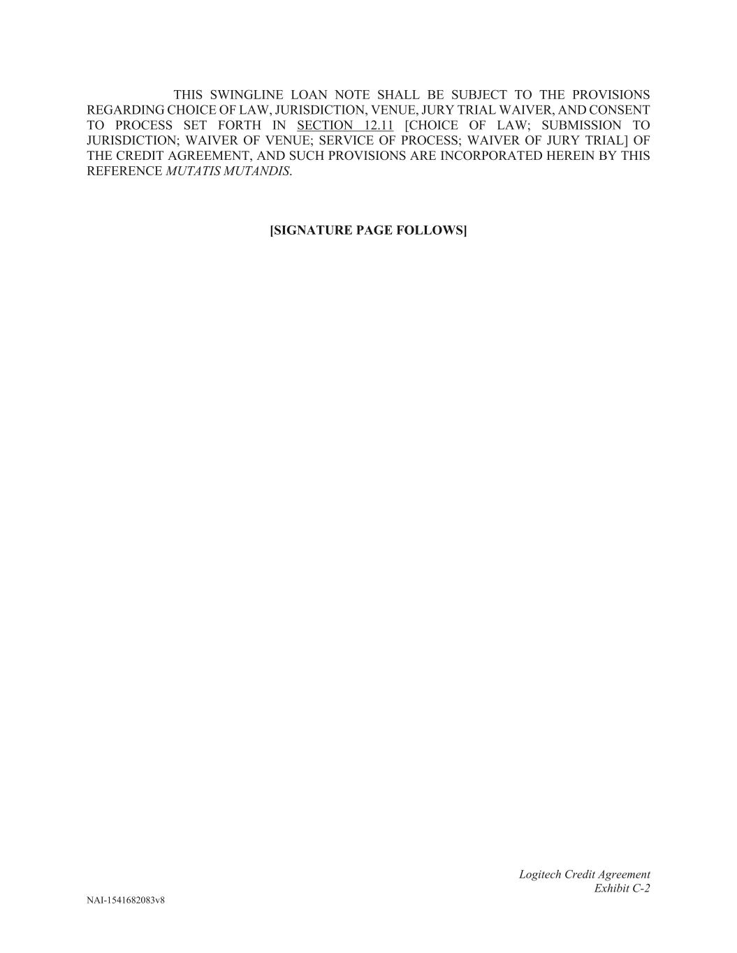NAI-1541682083v8 Logitech Credit Agreement Exhibit C-2 THIS SWINGLINE LOAN NOTE SHALL BE SUBJECT TO THE PROVISIONS REGARDING CHOICE OF LAW, JURISDICTION, VENUE, JURY TRIAL WAIVER, AND CONSENT TO PROCESS SET FORTH IN SECTION 12.11 [CHOICE OF LAW; SUBMISSION TO JURISDICTION; WAIVER OF VENUE; SERVICE OF PROCESS; WAIVER OF JURY TRIAL] OF THE CREDIT AGREEMENT, AND SUCH PROVISIONS ARE INCORPORATED HEREIN BY THIS REFERENCE MUTATIS MUTANDIS. [SIGNATURE PAGE FOLLOWS]