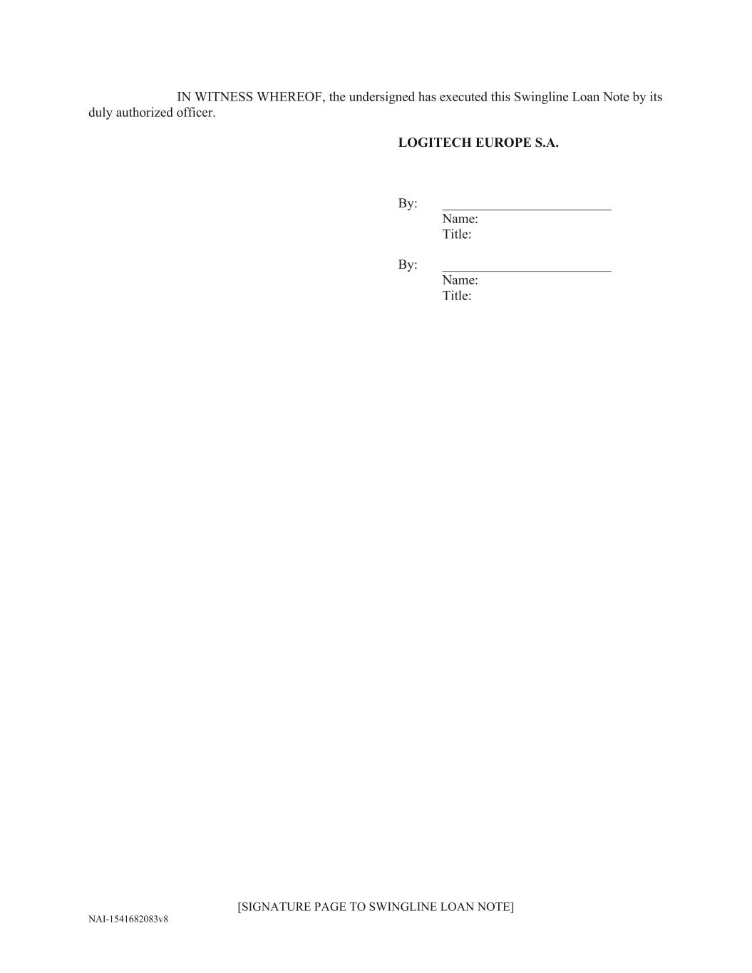 NAI-1541682083v8 [SIGNATURE PAGE TO SWINGLINE LOAN NOTE] IN WITNESS WHEREOF, the undersigned has executed this Swingline Loan Note by its duly authorized officer. LOGITECH EUROPE S.A. By: _________________________ Name: Title: By: _________________________ Name: Title: