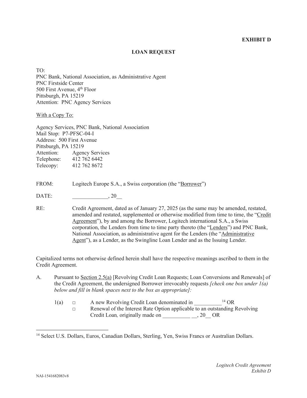 NAI-1541682083v8 Logitech Credit Agreement Exhibit D EXHIBIT D LOAN REQUEST TO: PNC Bank, National Association, as Administrative Agent PNC Firstside Center 500 First Avenue, 4th Floor Pittsburgh, PA 15219 Attention: PNC Agency Services With a Copy To: Agency Services, PNC Bank, National Association Mail Stop: P7-PFSC-04-I Address: 500 First Avenue Pittsburgh, PA 15219 Attention: Agency Services Telephone: 412 762 6442 Telecopy: 412 762 8672 FROM: Logitech Europe S.A., a Swiss corporation (the “Borrower”) DATE: _____________, 20__ RE: Credit Agreement, dated as of January 27, 2025 (as the same may be amended, restated, amended and restated, supplemented or otherwise modified from time to time, the “Credit Agreement”), by and among the Borrower, Logitech international S.A., a Swiss corporation, the Lenders from time to time party thereto (the “Lenders”) and PNC Bank, National Association, as administrative agent for the Lenders (the “Administrative Agent”), as a Lender, as the Swingline Loan Lender and as the Issuing Lender. Capitalized terms not otherwise defined herein shall have the respective meanings ascribed to them in the Credit Agreement. A. Pursuant to Section 2.5(a) [Revolving Credit Loan Requests; Loan Conversions and Renewals] of the Credit Agreement, the undersigned Borrower irrevocably requests [check one box under 1(a) below and fill in blank spaces next to the box as appropriate]: 1(a) A new Revolving Credit Loan denominated in __________14 OR Renewal of the Interest Rate Option applicable to an outstanding Revolving Credit Loan, originally made on __________ __, 20__ OR 14 Select U.S. Dollars, Euros, Canadian Dollars, Sterling, Yen, Swiss Francs or Australian Dollars.