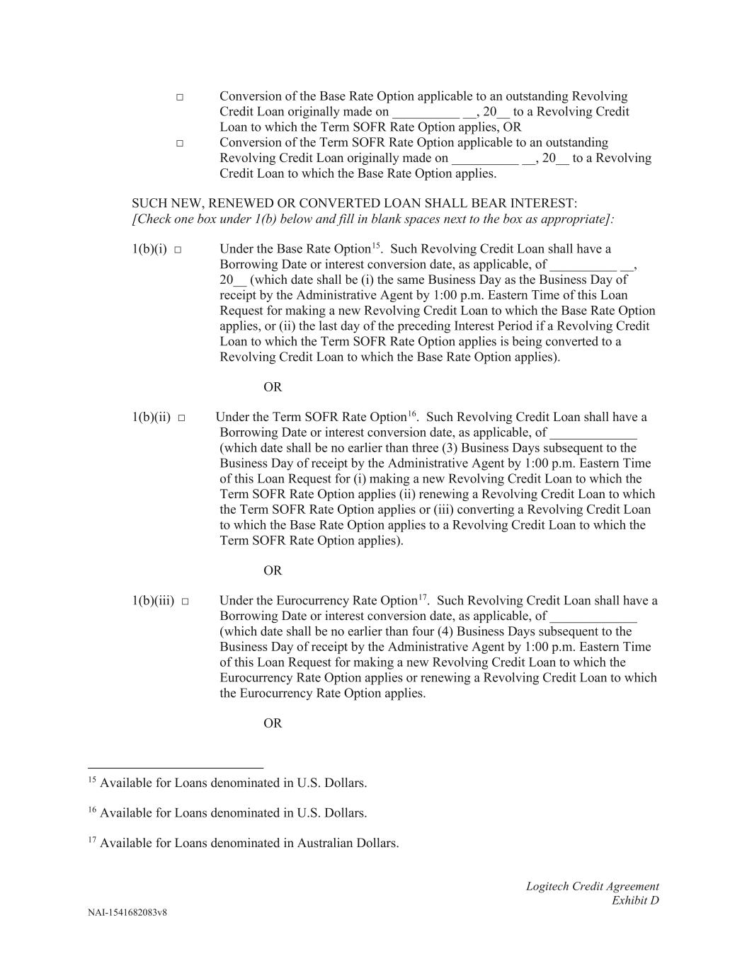 NAI-1541682083v8 Logitech Credit Agreement Exhibit D Conversion of the Base Rate Option applicable to an outstanding Revolving Credit Loan originally made on __________ __, 20__ to a Revolving Credit Loan to which the Term SOFR Rate Option applies, OR Conversion of the Term SOFR Rate Option applicable to an outstanding Revolving Credit Loan originally made on __________ __, 20__ to a Revolving Credit Loan to which the Base Rate Option applies. SUCH NEW, RENEWED OR CONVERTED LOAN SHALL BEAR INTEREST: [Check one box under 1(b) below and fill in blank spaces next to the box as appropriate]: Under the Base Rate Option15. Such Revolving Credit Loan shall have a Borrowing Date or interest conversion date, as applicable, of __________ __, 20__ (which date shall be (i) the same Business Day as the Business Day of receipt by the Administrative Agent by 1:00 p.m. Eastern Time of this Loan Request for making a new Revolving Credit Loan to which the Base Rate Option applies, or (ii) the last day of the preceding Interest Period if a Revolving Credit Loan to which the Term SOFR Rate Option applies is being converted to a Revolving Credit Loan to which the Base Rate Option applies). OR 1(b) Under the Term SOFR Rate Option16. Such Revolving Credit Loan shall have a Borrowing Date or interest conversion date, as applicable, of _____________ (which date shall be no earlier than three (3) Business Days subsequent to the Business Day of receipt by the Administrative Agent by 1:00 p.m. Eastern Time of this Loan Request for (i) making a new Revolving Credit Loan to which the Term SOFR Rate Option applies (ii) renewing a Revolving Credit Loan to which the Term SOFR Rate Option applies or (iii) converting a Revolving Credit Loan to which the Base Rate Option applies to a Revolving Credit Loan to which the Term SOFR Rate Option applies). OR Under the Eurocurrency Rate Option17. Such Revolving Credit Loan shall have a Borrowing Date or interest conversion date, as applicable, of _____________ (which date shall be no earlier than four (4) Business Days subsequent to the Business Day of receipt by the Administrative Agent by 1:00 p.m. Eastern Time of this Loan Request for making a new Revolving Credit Loan to which the Eurocurrency Rate Option applies or renewing a Revolving Credit Loan to which the Eurocurrency Rate Option applies. OR 15 Available for Loans denominated in U.S. Dollars. 16 Available for Loans denominated in U.S. Dollars. 17 Available for Loans denominated in Australian Dollars.