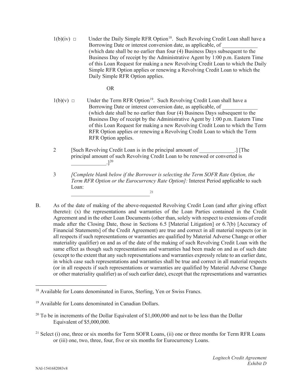 NAI-1541682083v8 Logitech Credit Agreement Exhibit D Under the Daily Simple RFR Option18. Such Revolving Credit Loan shall have a Borrowing Date or interest conversion date, as applicable, of _____________ (which date shall be no earlier than four (4) Business Days subsequent to the Business Day of receipt by the Administrative Agent by 1:00 p.m. Eastern Time of this Loan Request for making a new Revolving Credit Loan to which the Daily Simple RFR Option applies or renewing a Revolving Credit Loan to which the Daily Simple RFR Option applies. OR Under the Term RFR Option19. Such Revolving Credit Loan shall have a Borrowing Date or interest conversion date, as applicable, of _____________ (which date shall be no earlier than four (4) Business Days subsequent to the Business Day of receipt by the Administrative Agent by 1:00 p.m. Eastern Time of this Loan Request for making a new Revolving Credit Loan to which the Term RFR Option applies or renewing a Revolving Credit Loan to which the Term RFR Option applies. 2 [Such Revolving Credit Loan is in the principal amount of _____________.] [The principal amount of such Revolving Credit Loan to be renewed or converted is _____________.]20 3 [Complete blank below if the Borrower is selecting the Term SOFR Rate Option, the Term RFR Option or the Eurocurrency Rate Option]: Interest Period applicable to such Loan: _____________________________21 B. As of the date of making of the above-requested Revolving Credit Loan (and after giving effect thereto): (x) the representations and warranties of the Loan Parties contained in the Credit Agreement and in the other Loan Documents (other than, solely with respect to extensions of credit made after the Closing Date, those in Sections 6.5 [Material Litigation] or 6.7(b) [Accuracy of Financial Statements] of the Credit Agreement) are true and correct in all material respects (or in all respects if such representations or warranties are qualified by Material Adverse Change or other materiality qualifier) on and as of the date of the making of such Revolving Credit Loan with the same effect as though such representations and warranties had been made on and as of such date (except to the extent that any such representations and warranties expressly relate to an earlier date, in which case such representations and warranties shall be true and correct in all material respects (or in all respects if such representations or warranties are qualified by Material Adverse Change or other materiality qualifier) as of such earlier date), except that the representations and warranties 18 Available for Loans denominated in Euros, Sterling, Yen or Swiss Francs. 19 Available for Loans denominated in Canadian Dollars. 20 To be in increments of the Dollar Equivalent of $1,000,000 and not to be less than the Dollar Equivalent of $5,000,000. 21 Select (i) one, three or six months for Term SOFR Loans, (ii) one or three months for Term RFR Loans or (iii) one, two, three, four, five or six months for Eurocurrency Loans.