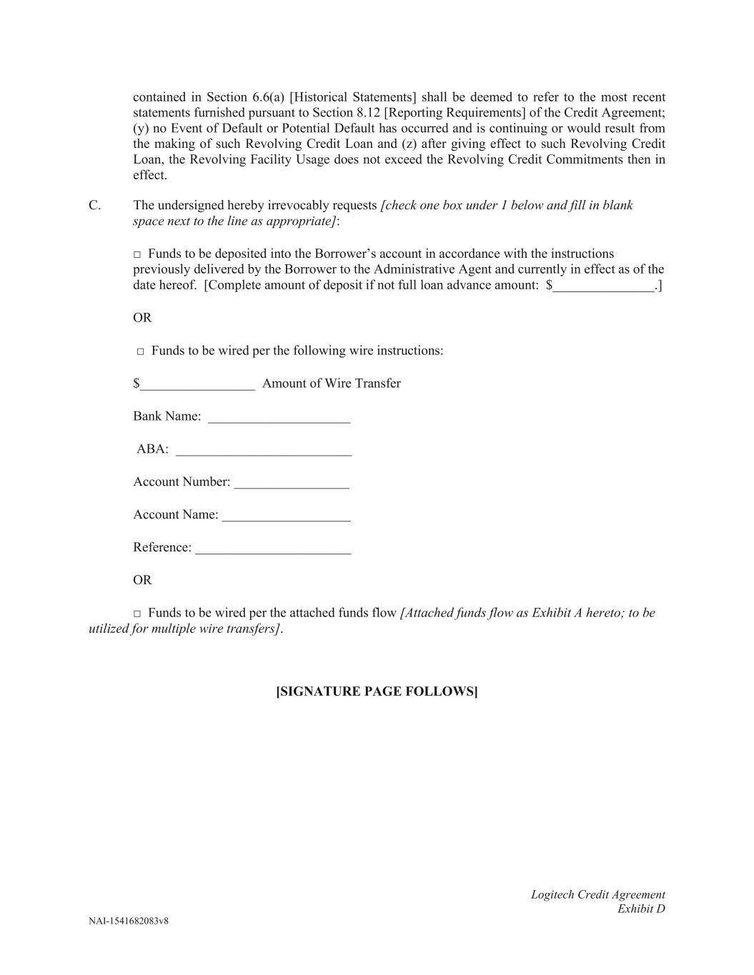 NAI-1541682083v8 Logitech Credit Agreement Exhibit D contained in Section 6.6(a) [Historical Statements] shall be deemed to refer to the most recent statements furnished pursuant to Section 8.12 [Reporting Requirements] of the Credit Agreement; (y) no Event of Default or Potential Default has occurred and is continuing or would result from the making of such Revolving Credit Loan and (z) after giving effect to such Revolving Credit Loan, the Revolving Facility Usage does not exceed the Revolving Credit Commitments then in effect. C. The undersigned hereby irrevocably requests [check one box under 1 below and fill in blank space next to the line as appropriate]: Borrower’s account in accordance with the instructions previously delivered by the Borrower to the Administrative Agent and currently in effect as of the date hereof. [Complete amount of deposit if not full loan advance amount: $_______________.] OR $_________________ Amount of Wire Transfer Bank Name: _____________________ ABA: __________________________ Account Number: _________________ Account Name: ___________________ Reference: _______________________ OR [Attached funds flow as Exhibit A hereto; to be utilized for multiple wire transfers]. [SIGNATURE PAGE FOLLOWS]