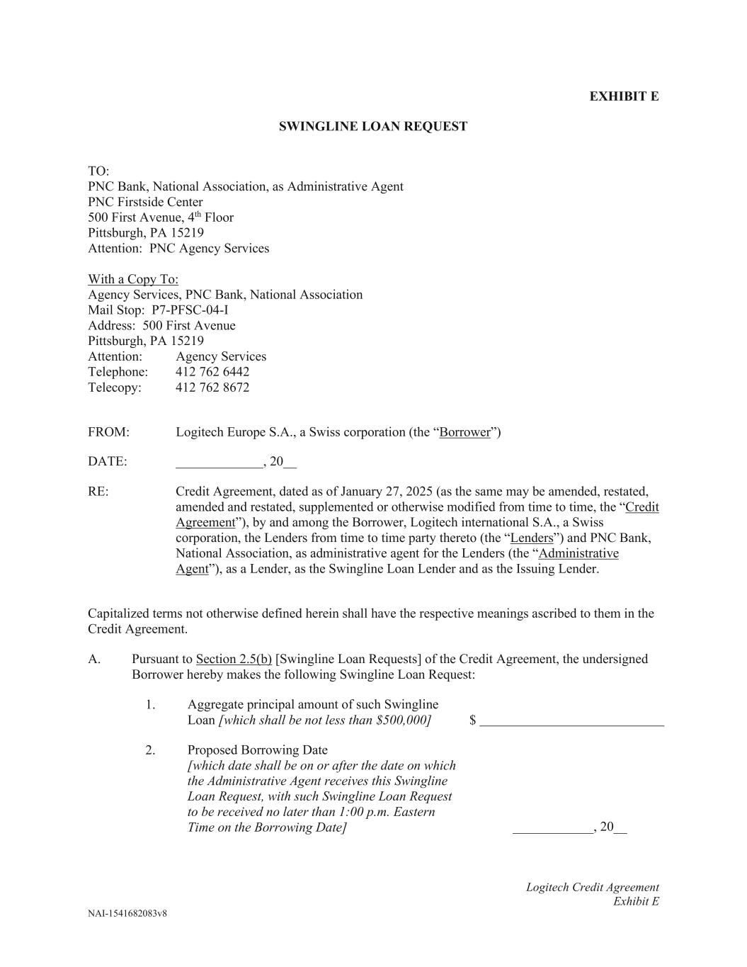 NAI-1541682083v8 Logitech Credit Agreement Exhibit E EXHIBIT E SWINGLINE LOAN REQUEST TO: PNC Bank, National Association, as Administrative Agent PNC Firstside Center 500 First Avenue, 4th Floor Pittsburgh, PA 15219 Attention: PNC Agency Services With a Copy To: Agency Services, PNC Bank, National Association Mail Stop: P7-PFSC-04-I Address: 500 First Avenue Pittsburgh, PA 15219 Attention: Agency Services Telephone: 412 762 6442 Telecopy: 412 762 8672 FROM: Logitech Europe S.A., a Swiss corporation (the “Borrower”) DATE: _____________, 20__ RE: Credit Agreement, dated as of January 27, 2025 (as the same may be amended, restated, amended and restated, supplemented or otherwise modified from time to time, the “Credit Agreement”), by and among the Borrower, Logitech international S.A., a Swiss corporation, the Lenders from time to time party thereto (the “Lenders”) and PNC Bank, National Association, as administrative agent for the Lenders (the “Administrative Agent”), as a Lender, as the Swingline Loan Lender and as the Issuing Lender. Capitalized terms not otherwise defined herein shall have the respective meanings ascribed to them in the Credit Agreement. A. Pursuant to Section 2.5(b) [Swingline Loan Requests] of the Credit Agreement, the undersigned Borrower hereby makes the following Swingline Loan Request: 1. Aggregate principal amount of such Swingline Loan [which shall be not less than $500,000] $ 2. Proposed Borrowing Date [which date shall be on or after the date on which the Administrative Agent receives this Swingline Loan Request, with such Swingline Loan Request to be received no later than 1:00 p.m. Eastern Time on the Borrowing Date] ____________, 20__