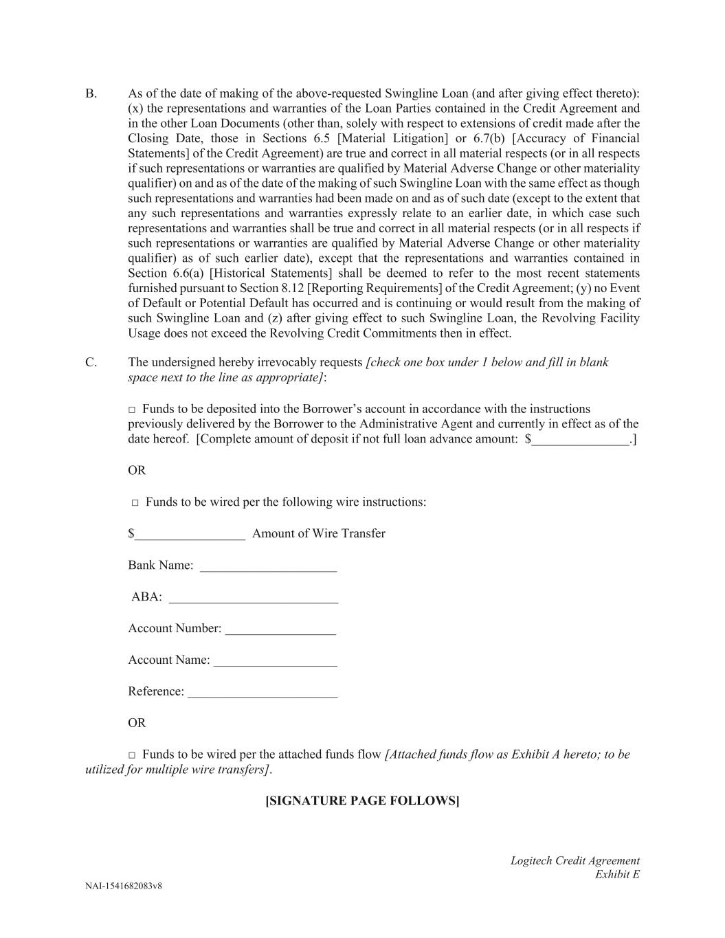 NAI-1541682083v8 Logitech Credit Agreement Exhibit E B. As of the date of making of the above-requested Swingline Loan (and after giving effect thereto): (x) the representations and warranties of the Loan Parties contained in the Credit Agreement and in the other Loan Documents (other than, solely with respect to extensions of credit made after the Closing Date, those in Sections 6.5 [Material Litigation] or 6.7(b) [Accuracy of Financial Statements] of the Credit Agreement) are true and correct in all material respects (or in all respects if such representations or warranties are qualified by Material Adverse Change or other materiality qualifier) on and as of the date of the making of such Swingline Loan with the same effect as though such representations and warranties had been made on and as of such date (except to the extent that any such representations and warranties expressly relate to an earlier date, in which case such representations and warranties shall be true and correct in all material respects (or in all respects if such representations or warranties are qualified by Material Adverse Change or other materiality qualifier) as of such earlier date), except that the representations and warranties contained in Section 6.6(a) [Historical Statements] shall be deemed to refer to the most recent statements furnished pursuant to Section 8.12 [Reporting Requirements] of the Credit Agreement; (y) no Event of Default or Potential Default has occurred and is continuing or would result from the making of such Swingline Loan and (z) after giving effect to such Swingline Loan, the Revolving Facility Usage does not exceed the Revolving Credit Commitments then in effect. C. The undersigned hereby irrevocably requests [check one box under 1 below and fill in blank space next to the line as appropriate]: previously delivered by the Borrower to the Administrative Agent and currently in effect as of the date hereof. [Complete amount of deposit if not full loan advance amount: $_______________.] OR $_________________ Amount of Wire Transfer Bank Name: _____________________ ABA: __________________________ Account Number: _________________ Account Name: ___________________ Reference: _______________________ OR [Attached funds flow as Exhibit A hereto; to be utilized for multiple wire transfers]. [SIGNATURE PAGE FOLLOWS]