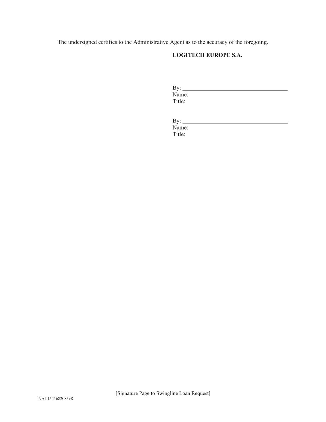 NAI-1541682083v8 [Signature Page to Swingline Loan Request] The undersigned certifies to the Administrative Agent as to the accuracy of the foregoing. LOGITECH EUROPE S.A. By: Name: Title: By: Name: Title: