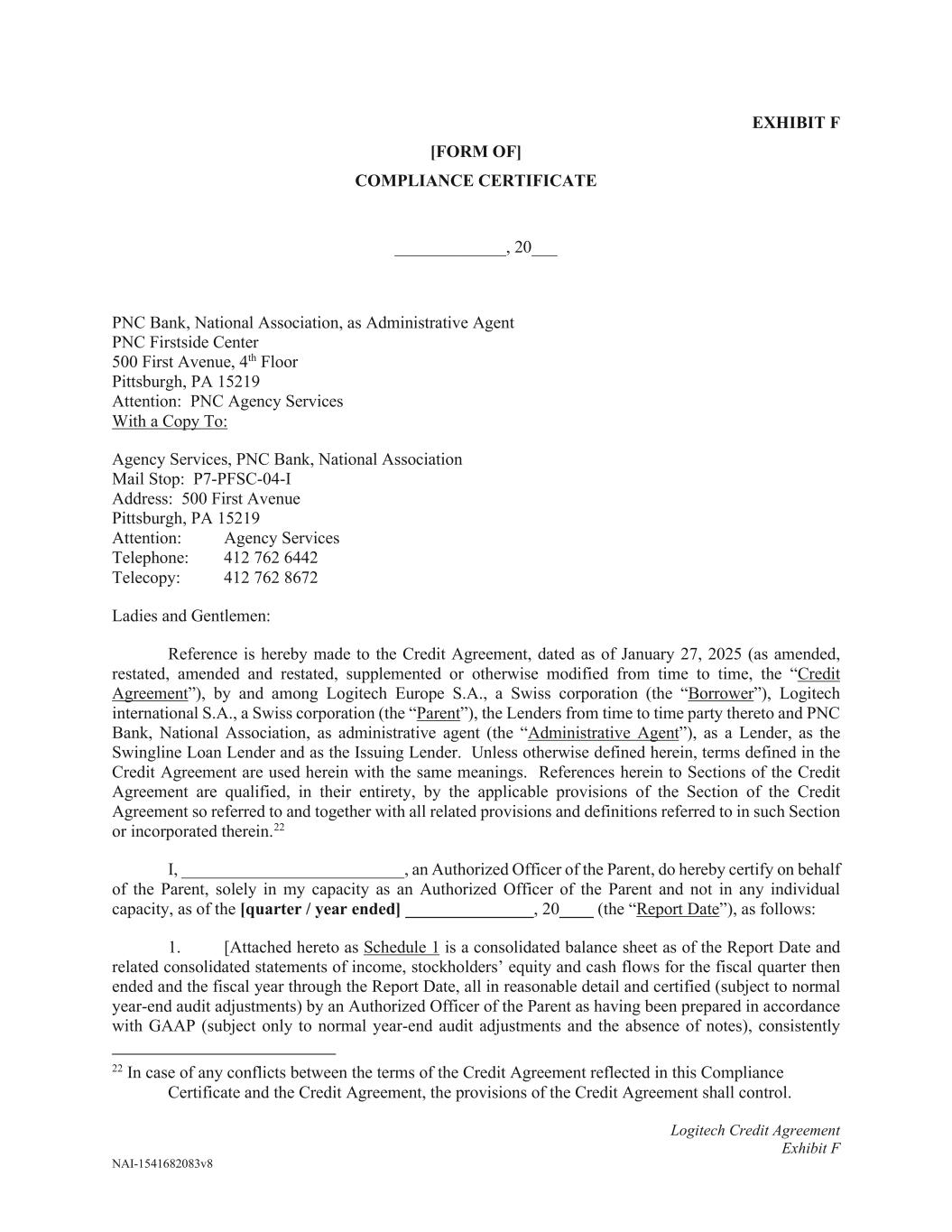 NAI-1541682083v8 Logitech Credit Agreement Exhibit F EXHIBIT F [FORM OF] COMPLIANCE CERTIFICATE _____________, 20___ PNC Bank, National Association, as Administrative Agent PNC Firstside Center 500 First Avenue, 4th Floor Pittsburgh, PA 15219 Attention: PNC Agency Services With a Copy To: Agency Services, PNC Bank, National Association Mail Stop: P7-PFSC-04-I Address: 500 First Avenue Pittsburgh, PA 15219 Attention: Agency Services Telephone: 412 762 6442 Telecopy: 412 762 8672 Ladies and Gentlemen: Reference is hereby made to the Credit Agreement, dated as of January 27, 2025 (as amended, restated, amended and restated, supplemented or otherwise modified from time to time, the “Credit Agreement”), by and among Logitech Europe S.A., a Swiss corporation (the “Borrower”), Logitech international S.A., a Swiss corporation (the “Parent”), the Lenders from time to time party thereto and PNC Bank, National Association, as administrative agent (the “Administrative Agent”), as a Lender, as the Swingline Loan Lender and as the Issuing Lender. Unless otherwise defined herein, terms defined in the Credit Agreement are used herein with the same meanings. References herein to Sections of the Credit Agreement are qualified, in their entirety, by the applicable provisions of the Section of the Credit Agreement so referred to and together with all related provisions and definitions referred to in such Section or incorporated therein.22 I, __________________________, an Authorized Officer of the Parent, do hereby certify on behalf of the Parent, solely in my capacity as an Authorized Officer of the Parent and not in any individual capacity, as of the [quarter / year ended] _______________, 20____ (the “Report Date”), as follows: 1. [Attached hereto as Schedule 1 is a consolidated balance sheet as of the Report Date and related consolidated statements of income, stockholders’ equity and cash flows for the fiscal quarter then ended and the fiscal year through the Report Date, all in reasonable detail and certified (subject to normal year-end audit adjustments) by an Authorized Officer of the Parent as having been prepared in accordance with GAAP (subject only to normal year-end audit adjustments and the absence of notes), consistently 22 In case of any conflicts between the terms of the Credit Agreement reflected in this Compliance Certificate and the Credit Agreement, the provisions of the Credit Agreement shall control.