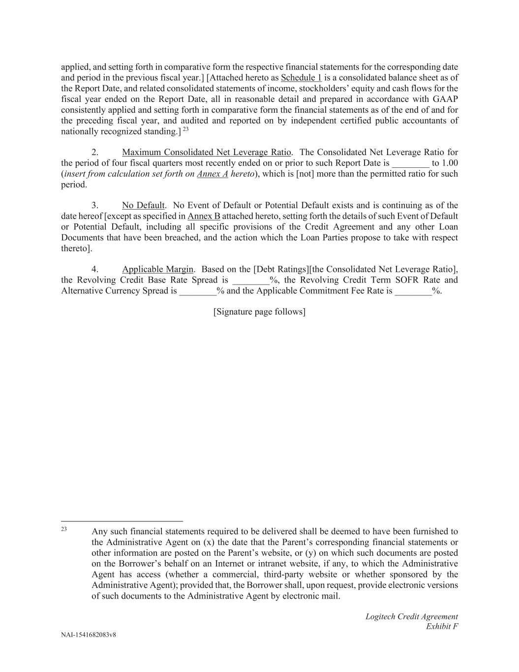 NAI-1541682083v8 Logitech Credit Agreement Exhibit F applied, and setting forth in comparative form the respective financial statements for the corresponding date and period in the previous fiscal year.] [Attached hereto as Schedule 1 is a consolidated balance sheet as of the Report Date, and related consolidated statements of income, stockholders’ equity and cash flows for the fiscal year ended on the Report Date, all in reasonable detail and prepared in accordance with GAAP consistently applied and setting forth in comparative form the financial statements as of the end of and for the preceding fiscal year, and audited and reported on by independent certified public accountants of nationally recognized standing.] 23 2. Maximum Consolidated Net Leverage Ratio. The Consolidated Net Leverage Ratio for the period of four fiscal quarters most recently ended on or prior to such Report Date is ________ to 1.00 (insert from calculation set forth on Annex A hereto), which is [not] more than the permitted ratio for such period. 3. No Default. No Event of Default or Potential Default exists and is continuing as of the date hereof [except as specified in Annex B attached hereto, setting forth the details of such Event of Default or Potential Default, including all specific provisions of the Credit Agreement and any other Loan Documents that have been breached, and the action which the Loan Parties propose to take with respect thereto]. 4. Applicable Margin. Based on the [Debt Ratings][the Consolidated Net Leverage Ratio], the Revolving Credit Base Rate Spread is ________%, the Revolving Credit Term SOFR Rate and Alternative Currency Spread is ________% and the Applicable Commitment Fee Rate is ________%. [Signature page follows] 23 Any such financial statements required to be delivered shall be deemed to have been furnished to the Administrative Agent on (x) the date that the Parent’s corresponding financial statements or other information are posted on the Parent’s website, or (y) on which such documents are posted on the Borrower’s behalf on an Internet or intranet website, if any, to which the Administrative Agent has access (whether a commercial, third-party website or whether sponsored by the Administrative Agent); provided that, the Borrower shall, upon request, provide electronic versions of such documents to the Administrative Agent by electronic mail.
