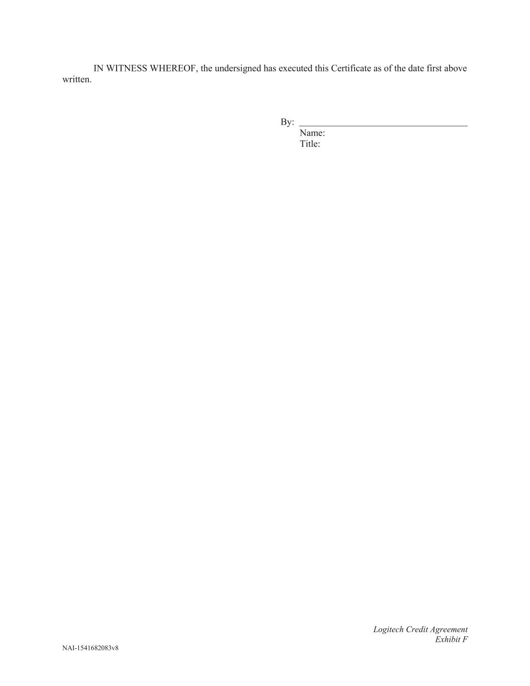 NAI-1541682083v8 Logitech Credit Agreement Exhibit F IN WITNESS WHEREOF, the undersigned has executed this Certificate as of the date first above written. By: Name: Title: