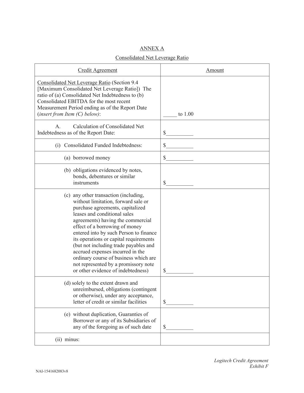 NAI-1541682083v8 Logitech Credit Agreement Exhibit F ANNEX A Consolidated Net Leverage Ratio Credit Agreement Amount Consolidated Net Leverage Ratio (Section 9.4 [Maximum Consolidated Net Leverage Ratio]) The ratio of (a) Consolidated Net Indebtedness to (b) Consolidated EBITDA for the most recent Measurement Period ending as of the Report Date (insert from Item (C) below): _____ to 1.00 A. Calculation of Consolidated Net Indebtedness as of the Report Date: $__________ (i) Consolidated Funded Indebtedness: $__________ (a) borrowed money $__________ (b) obligations evidenced by notes, bonds, debentures or similar instruments $__________ (c) any other transaction (including, without limitation, forward sale or purchase agreements, capitalized leases and conditional sales agreements) having the commercial effect of a borrowing of money entered into by such Person to finance its operations or capital requirements (but not including trade payables and accrued expenses incurred in the ordinary course of business which are not represented by a promissory note or other evidence of indebtedness) $__________ (d) solely to the extent drawn and unreimbursed, obligations (contingent or otherwise), under any acceptance, letter of credit or similar facilities $__________ (e) without duplication, Guaranties of Borrower or any of its Subsidiaries of any of the foregoing as of such date $__________ (ii) minus:
