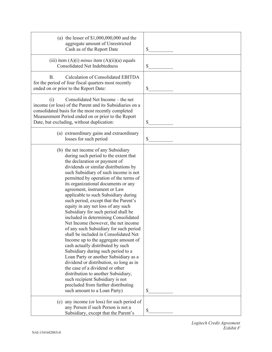 NAI-1541682083v8 Logitech Credit Agreement Exhibit F (a) the lesser of $1,000,000,000 and the aggregate amount of Unrestricted Cash as of the Report Date $__________ (iii) item (A)(i) minus item (A)(ii)(a) equals Consolidated Net Indebtedness $__________ B. Calculation of Consolidated EBITDA for the period of four fiscal quarters most recently ended on or prior to the Report Date: $__________ (i) Consolidated Net Income – the net income (or loss) of the Parent and its Subsidiaries on a consolidated basis for the most recently completed Measurement Period ended on or prior to the Report Date, but excluding, without duplication: $__________ (a) extraordinary gains and extraordinary losses for such period $__________ (b) the net income of any Subsidiary during such period to the extent that the declaration or payment of dividends or similar distributions by such Subsidiary of such income is not permitted by operation of the terms of its organizational documents or any agreement, instrument or Law applicable to such Subsidiary during such period, except that the Parent’s equity in any net loss of any such Subsidiary for such period shall be included in determining Consolidated Net Income (however, the net income of any such Subsidiary for such period shall be included in Consolidated Net Income up to the aggregate amount of cash actually distributed by such Subsidiary during such period to a Loan Party or another Subsidiary as a dividend or distribution, so long as in the case of a dividend or other distribution to another Subsidiary, such recipient Subsidiary is not precluded from further distributing such amount to a Loan Party) $__________ (c) any income (or loss) for such period of any Person if such Person is not a Subsidiary, except that the Parent’s $__________
