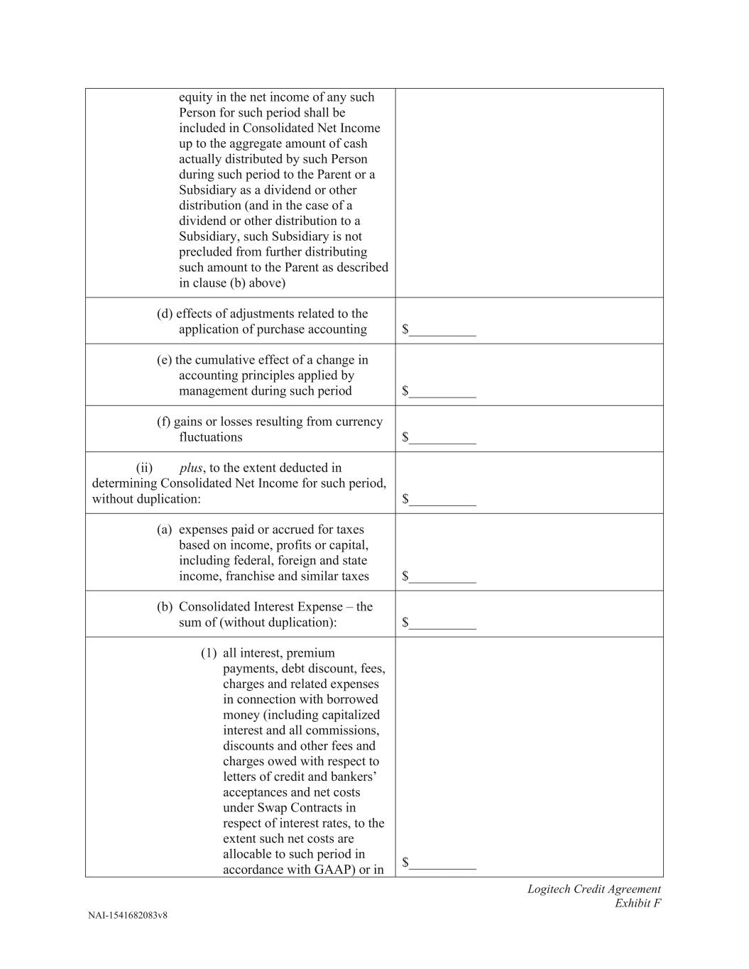 NAI-1541682083v8 Logitech Credit Agreement Exhibit F equity in the net income of any such Person for such period shall be included in Consolidated Net Income up to the aggregate amount of cash actually distributed by such Person during such period to the Parent or a Subsidiary as a dividend or other distribution (and in the case of a dividend or other distribution to a Subsidiary, such Subsidiary is not precluded from further distributing such amount to the Parent as described in clause (b) above) (d) effects of adjustments related to the application of purchase accounting $__________ (e) the cumulative effect of a change in accounting principles applied by management during such period $__________ (f) gains or losses resulting from currency fluctuations $__________ (ii) plus, to the extent deducted in determining Consolidated Net Income for such period, without duplication: $__________ (a) expenses paid or accrued for taxes based on income, profits or capital, including federal, foreign and state income, franchise and similar taxes $__________ (b) Consolidated Interest Expense – the sum of (without duplication): $__________ (1) all interest, premium payments, debt discount, fees, charges and related expenses in connection with borrowed money (including capitalized interest and all commissions, discounts and other fees and charges owed with respect to letters of credit and bankers’ acceptances and net costs under Swap Contracts in respect of interest rates, to the extent such net costs are allocable to such period in accordance with GAAP) or in $__________