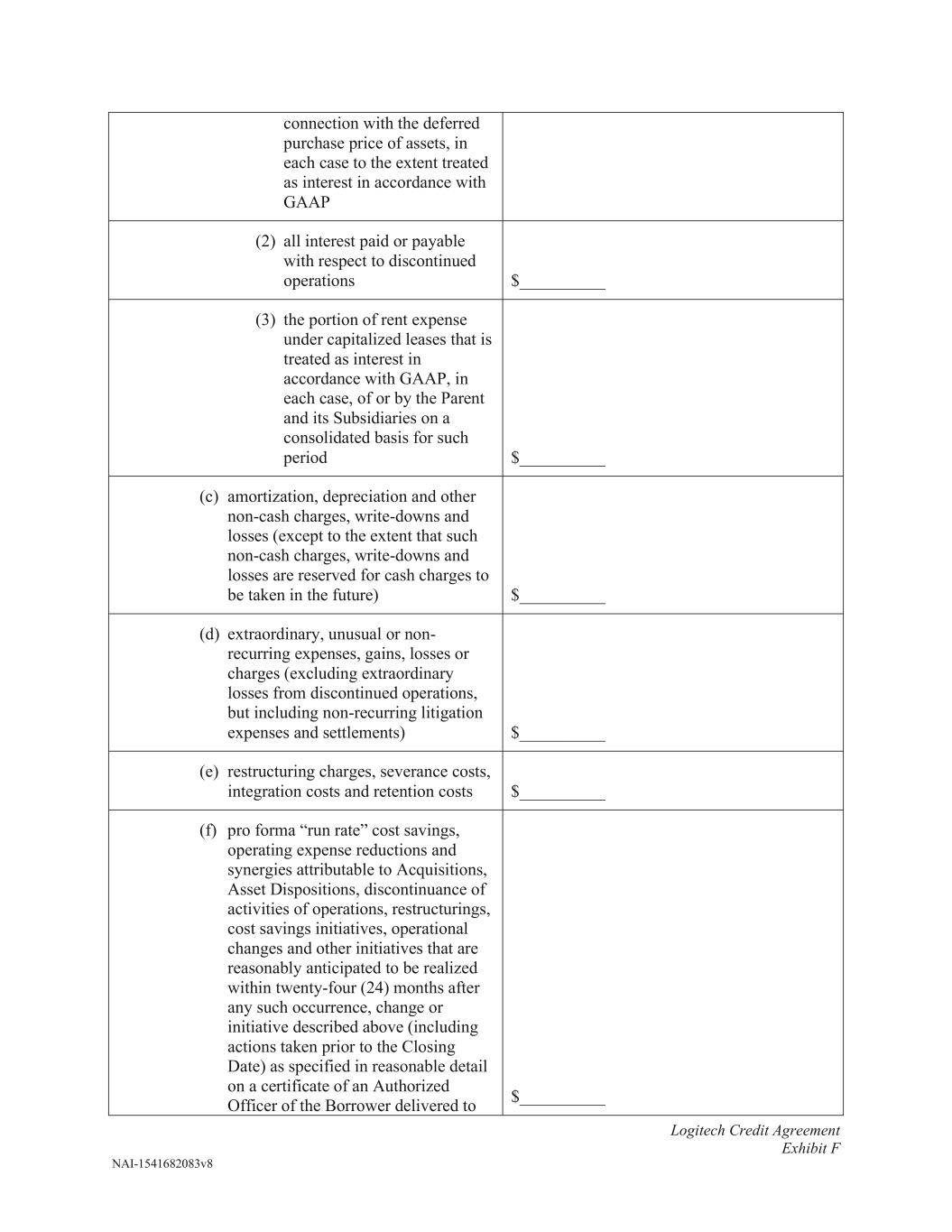 NAI-1541682083v8 Logitech Credit Agreement Exhibit F connection with the deferred purchase price of assets, in each case to the extent treated as interest in accordance with GAAP (2) all interest paid or payable with respect to discontinued operations $__________ (3) the portion of rent expense under capitalized leases that is treated as interest in accordance with GAAP, in each case, of or by the Parent and its Subsidiaries on a consolidated basis for such period $__________ (c) amortization, depreciation and other non-cash charges, write-downs and losses (except to the extent that such non-cash charges, write-downs and losses are reserved for cash charges to be taken in the future) $__________ (d) extraordinary, unusual or non- recurring expenses, gains, losses or charges (excluding extraordinary losses from discontinued operations, but including non-recurring litigation expenses and settlements) $__________ (e) restructuring charges, severance costs, integration costs and retention costs $__________ (f) pro forma “run rate” cost savings, operating expense reductions and synergies attributable to Acquisitions, Asset Dispositions, discontinuance of activities of operations, restructurings, cost savings initiatives, operational changes and other initiatives that are reasonably anticipated to be realized within twenty-four (24) months after any such occurrence, change or initiative described above (including actions taken prior to the Closing Date) as specified in reasonable detail on a certificate of an Authorized Officer of the Borrower delivered to $__________