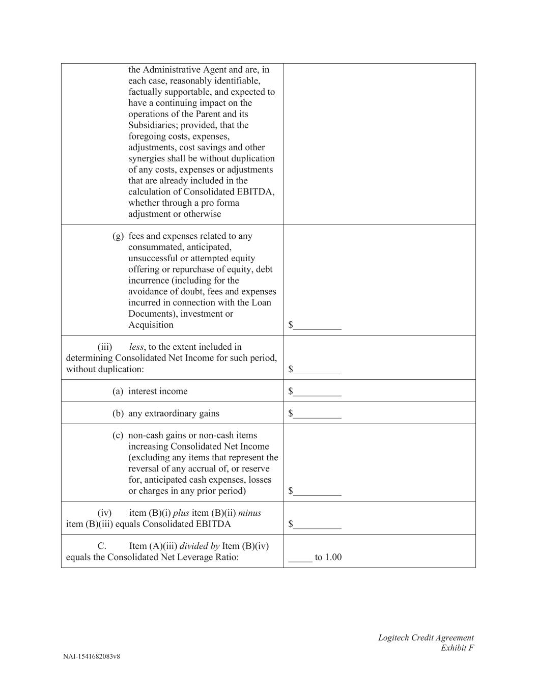 NAI-1541682083v8 Logitech Credit Agreement Exhibit F the Administrative Agent and are, in each case, reasonably identifiable, factually supportable, and expected to have a continuing impact on the operations of the Parent and its Subsidiaries; provided, that the foregoing costs, expenses, adjustments, cost savings and other synergies shall be without duplication of any costs, expenses or adjustments that are already included in the calculation of Consolidated EBITDA, whether through a pro forma adjustment or otherwise (g) fees and expenses related to any consummated, anticipated, unsuccessful or attempted equity offering or repurchase of equity, debt incurrence (including for the avoidance of doubt, fees and expenses incurred in connection with the Loan Documents), investment or Acquisition $__________ (iii) less, to the extent included in determining Consolidated Net Income for such period, without duplication: $__________ (a) interest income $__________ (b) any extraordinary gains $__________ (c) non-cash gains or non-cash items increasing Consolidated Net Income (excluding any items that represent the reversal of any accrual of, or reserve for, anticipated cash expenses, losses or charges in any prior period) $__________ (iv) item (B)(i) plus item (B)(ii) minus item (B)(iii) equals Consolidated EBITDA $__________ C. Item (A)(iii) divided by Item (B)(iv) equals the Consolidated Net Leverage Ratio: _____ to 1.00