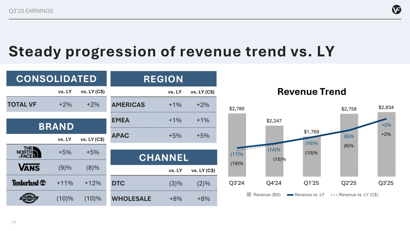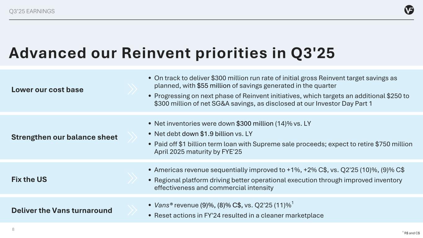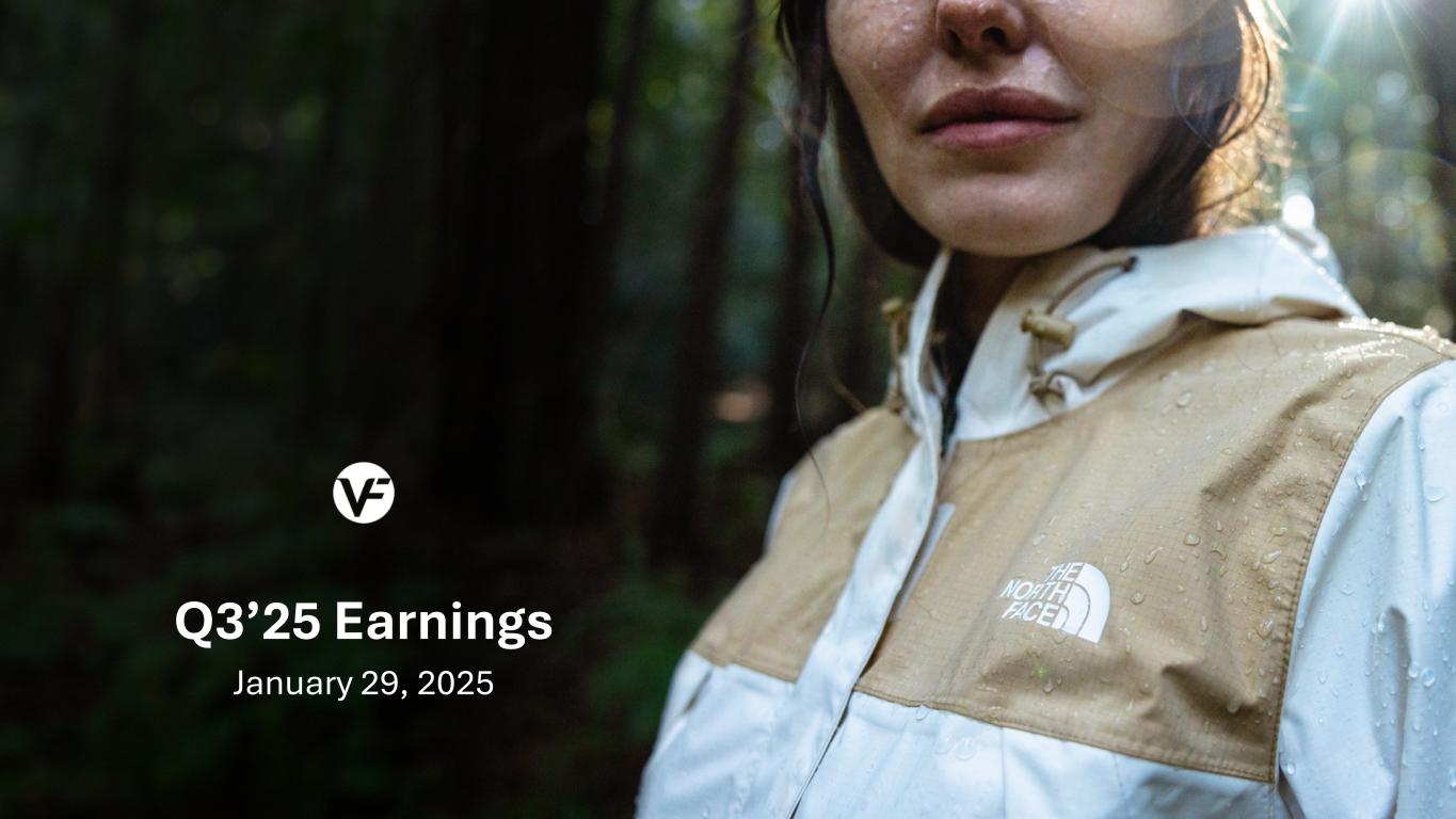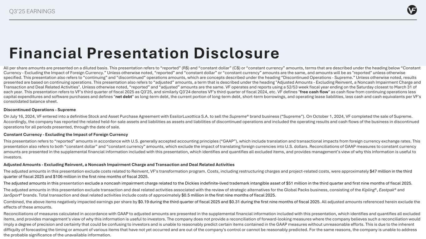 Financial Presentation Disclosure All per share amounts are presented on a diluted basis. This presentation refers to “reported” (R$) and “constant dollar” (C$) or “constant currency” amounts, terms that are described under the heading below “Constant Currency - Excluding the Impact of Foreign Currency.” Unless otherwise noted, “reported” and “constant dollar” or “constant currency” amounts are the same, and amounts will be as "reported" unless otherwise specified. This presentation also refers to “continuing” and “discontinued” operations amounts, which are concepts described under the heading “Discontinued Operations - Supreme.” Unless otherwise noted, results presented are based on continuing operations. This presentation also refers to “adjusted” amounts, a term that is described under the heading "Adjusted Amounts - Excluding Reinvent, a Noncash Impairment Charge and Transaction and Deal Related Activities". Unless otherwise noted, “reported” and “adjusted” amounts are the same. VF operates and reports using a 52/53 week fiscal year ending on the Saturday closest to March 31 of each year. This presentation refers to VF's third quarter of fiscal 2025 as Q3'25, and similarly Q3'24 denotes VF's third quarter of fiscal 2024, etc. VF defines "free cash flow" as cash flow from continuing operations less capital expenditures and software purchases and defines "net debt" as long-term debt, the current portion of long-term debt, short-term borrowings, and operating lease liabilities, less cash and cash equivalents per VF's consolidated balance sheet. Discontinued Operations - Supreme On July 16, 2024, VF entered into a definitive Stock and Asset Purchase Agreement with EssilorLuxottica S.A. to sell the Supreme® brand business (“Supreme”). On October 1, 2024, VF completed the sale of Supreme. Accordingly, the company has reported the related held-for-sale assets and liabilities as assets and liabilities of discontinued operations and included the operating results and cash flows of the business in discontinued operations for all periods presented, through the date of sale. Constant Currency - Excluding the Impact of Foreign Currency This presentation refers to “reported” amounts in accordance with U.S. generally accepted accounting principles (“GAAP”), which include translation and transactional impacts from foreign currency exchange rates. This presentation also refers to both “constant dollar” and “constant currency” amounts, which exclude the impact of translating foreign currencies into U.S. dollars. Reconciliations of GAAP measures to constant currency amounts are presented in the supplemental financial information included with this presentation, which identifies and quantifies all excluded items, and provides management’s view of why this information is useful to investors. Adjusted Amounts - Excluding Reinvent, a Noncash Impairment Charge and Transaction and Deal Related Activities The adjusted amounts in this presentation exclude costs related to Reinvent, VF's transformation program. Costs, including restructuring charges and project-related costs, were approximately $47 million in the third quarter of fiscal 2025 and $106 million in the first nine months of fiscal 2025. The adjusted amounts in this presentation exclude a noncash impairment charge related to the Dickies indefinite-lived trademark intangible asset of $51 million in the third quarter and first nine months of fiscal 2025. The adjusted amounts in this presentation exclude transaction and deal related activities associated with the review of strategic alternatives for the Global Packs business, consisting of the Kipling®, Eastpak® and JanSport® brands. Total transaction and deal related activities include costs of approximately $0.5 million in the first nine months of fiscal 2025. Combined, the above items negatively impacted earnings per share by $0.19 during the third quarter of fiscal 2025 and $0.31 during the first nine months of fiscal 2025. All adjusted amounts referenced herein exclude the effects of these amounts. Reconciliations of measures calculated in accordance with GAAP to adjusted amounts are presented in the supplemental financial information included with this presentation, which identifies and quantifies all excluded items, and provides management’s view of why this information is useful to investors. The company does not provide a reconciliation of forward-looking measures where the company believes such a reconciliation would imply a degree of precision and certainty that could be confusing to investors and is unable to reasonably predict certain items contained in the GAAP measures without unreasonable efforts. This is due to the inherent difficulty of forecasting the timing or amount of various items that have not yet occurred and are out of the company's control or cannot be reasonably predicted. For the same reasons, the company is unable to address the probable significance of the unavailable information. Q3’25 EARNINGS 2