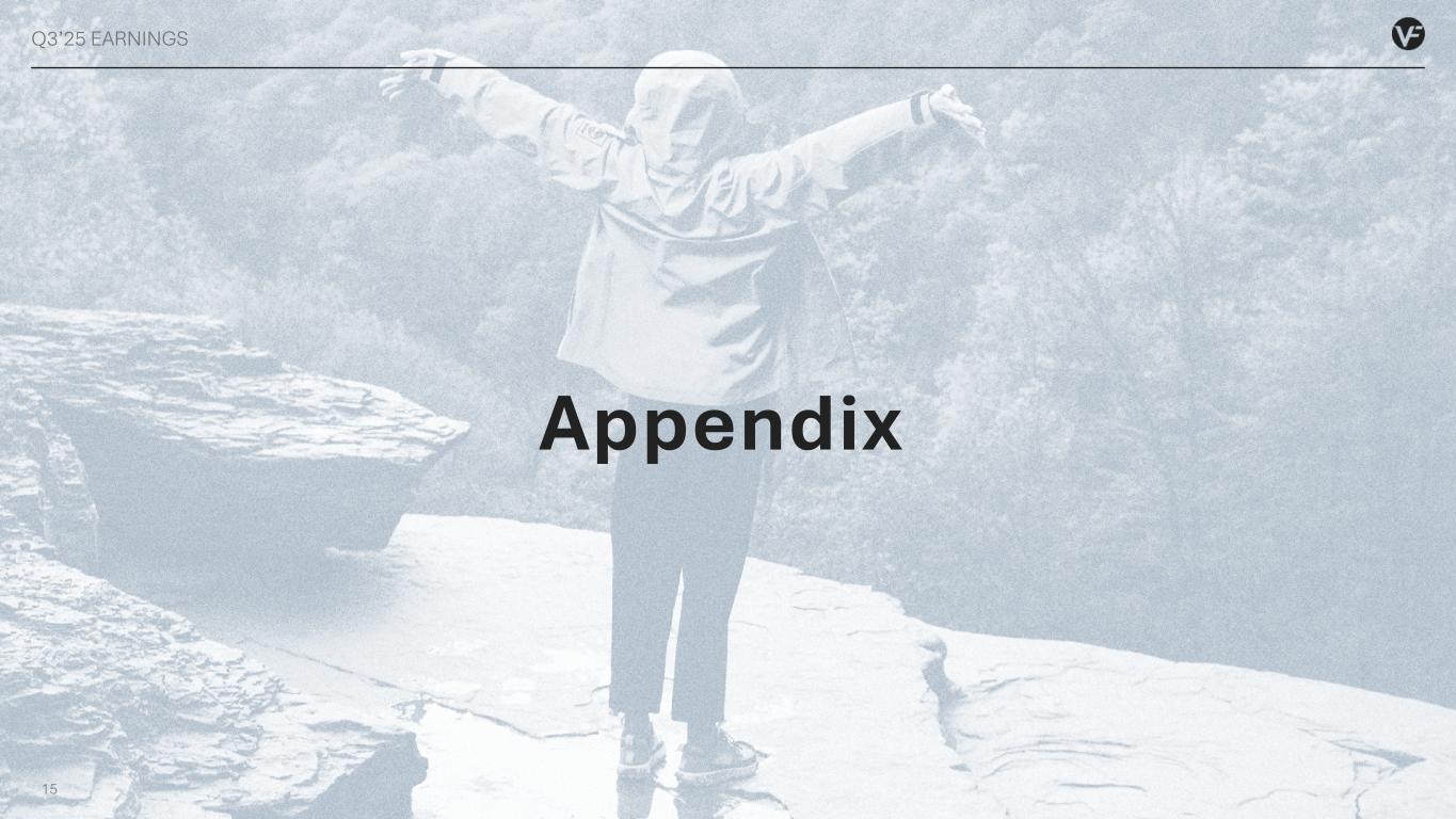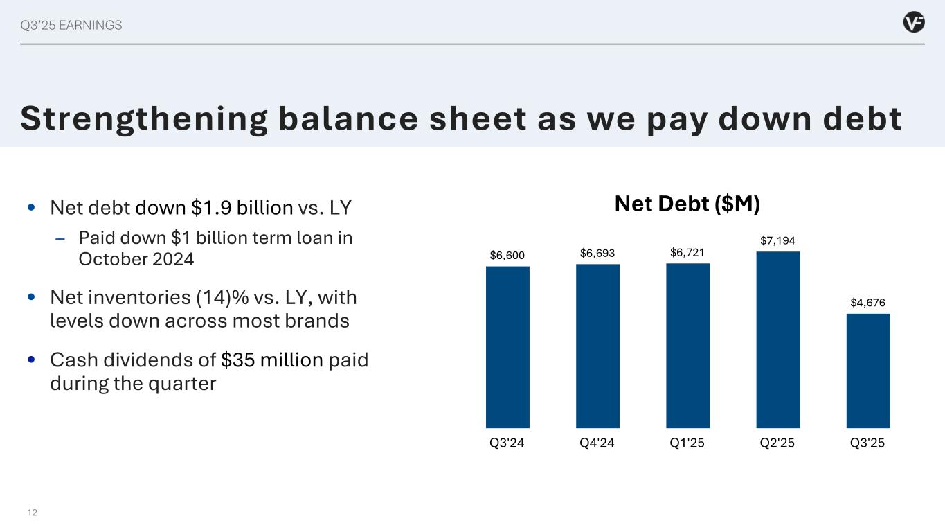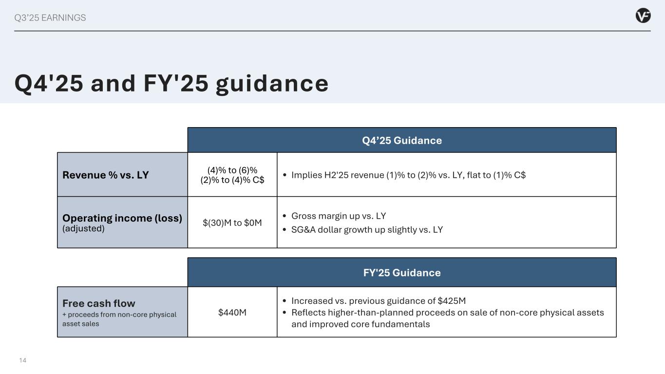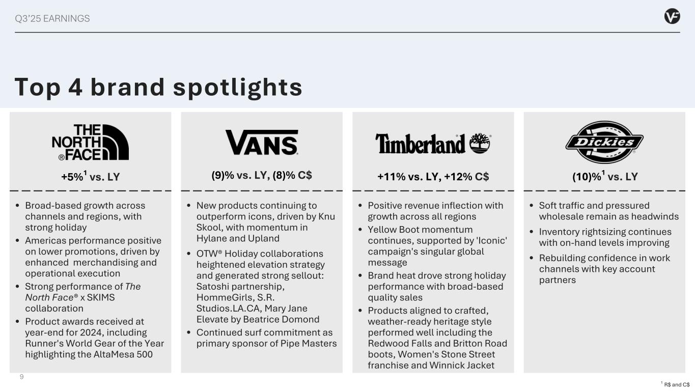 Financial Presentation Disclosure All per share amounts are presented on a diluted basis. This presentation refers to “reported” (R$) and “constant dollar” (C$) or “constant currency” amounts, terms that are described under the heading below “Constant Currency - Excluding the Impact of Foreign Currency.” Unless otherwise noted, “reported” and “constant dollar” or “constant currency” amounts are the same, and amounts will be as "reported" unless otherwise specified. This presentation also refers to “continuing” and “discontinued” operations amounts, which are concepts described under the heading “Discontinued Operations - Supreme.” Unless otherwise noted, results presented are based on continuing operations. This presentation also refers to “adjusted” amounts, a term that is described under the heading "Adjusted Amounts - Excluding Reinvent, a Noncash Impairment Charge and Transaction and Deal Related Activities". Unless otherwise noted, “reported” and “adjusted” amounts are the same. VF operates and reports using a 52/53 week fiscal year ending on the Saturday closest to March 31 of each year. This presentation refers to VF's third quarter of fiscal 2025 as Q3'25, and similarly Q3'24 denotes VF's third quarter of fiscal 2024, etc. VF defines "free cash flow" as cash flow from continuing operations less capital expenditures and software purchases and defines "net debt" as long-term debt, the current portion of long-term debt, short-term borrowings, and operating lease liabilities, less cash and cash equivalents per VF's consolidated balance sheet. Discontinued Operations - Supreme On July 16, 2024, VF entered into a definitive Stock and Asset Purchase Agreement with EssilorLuxottica S.A. to sell the Supreme® brand business (“Supreme”). On October 1, 2024, VF completed the sale of Supreme. Accordingly, the company has reported the related held-for-sale assets and liabilities as assets and liabilities of discontinued operations and included the operating results and cash flows of the business in discontinued operations for all periods presented, through the date of sale. Constant Currency - Excluding the Impact of Foreign Currency This presentation refers to “reported” amounts in accordance with U.S. generally accepted accounting principles (“GAAP”), which include translation and transactional impacts from foreign currency exchange rates. This presentation also refers to both “constant dollar” and “constant currency” amounts, which exclude the impact of translating foreign currencies into U.S. dollars. Reconciliations of GAAP measures to constant currency amounts are presented in the supplemental financial information included with this presentation, which identifies and quantifies all excluded items, and provides management’s view of why this information is useful to investors. Adjusted Amounts - Excluding Reinvent, a Noncash Impairment Charge and Transaction and Deal Related Activities The adjusted amounts in this presentation exclude costs related to Reinvent, VF's transformation program. Costs, including restructuring charges and project-related costs, were approximately $47 million in the third quarter of fiscal 2025 and $106 million in the first nine months of fiscal 2025. The adjusted amounts in this presentation exclude a noncash impairment charge related to the Dickies indefinite-lived trademark intangible asset of $51 million in the third quarter and first nine months of fiscal 2025. The adjusted amounts in this presentation exclude transaction and deal related activities associated with the review of strategic alternatives for the Global Packs business, consisting of the Kipling®, Eastpak® and JanSport® brands. Total transaction and deal related activities include costs of approximately $0.5 million in the first nine months of fiscal 2025. Combined, the above items negatively impacted earnings per share by $0.19 during the third quarter of fiscal 2025 and $0.31 during the first nine months of fiscal 2025. All adjusted amounts referenced herein exclude the effects of these amounts. Reconciliations of measures calculated in accordance with GAAP to adjusted amounts are presented in the supplemental financial information included with this presentation, which identifies and quantifies all excluded items, and provides management’s view of why this information is useful to investors. The company does not provide a reconciliation of forward-looking measures where the company believes such a reconciliation would imply a degree of precision and certainty that could be confusing to investors and is unable to reasonably predict certain items contained in the GAAP measures without unreasonable efforts. This is due to the inherent difficulty of forecasting the timing or amount of various items that have not yet occurred and are out of the company's control or cannot be reasonably predicted. For the same reasons, the company is unable to address the probable significance of the unavailable information. Q3’25 EARNINGS 2