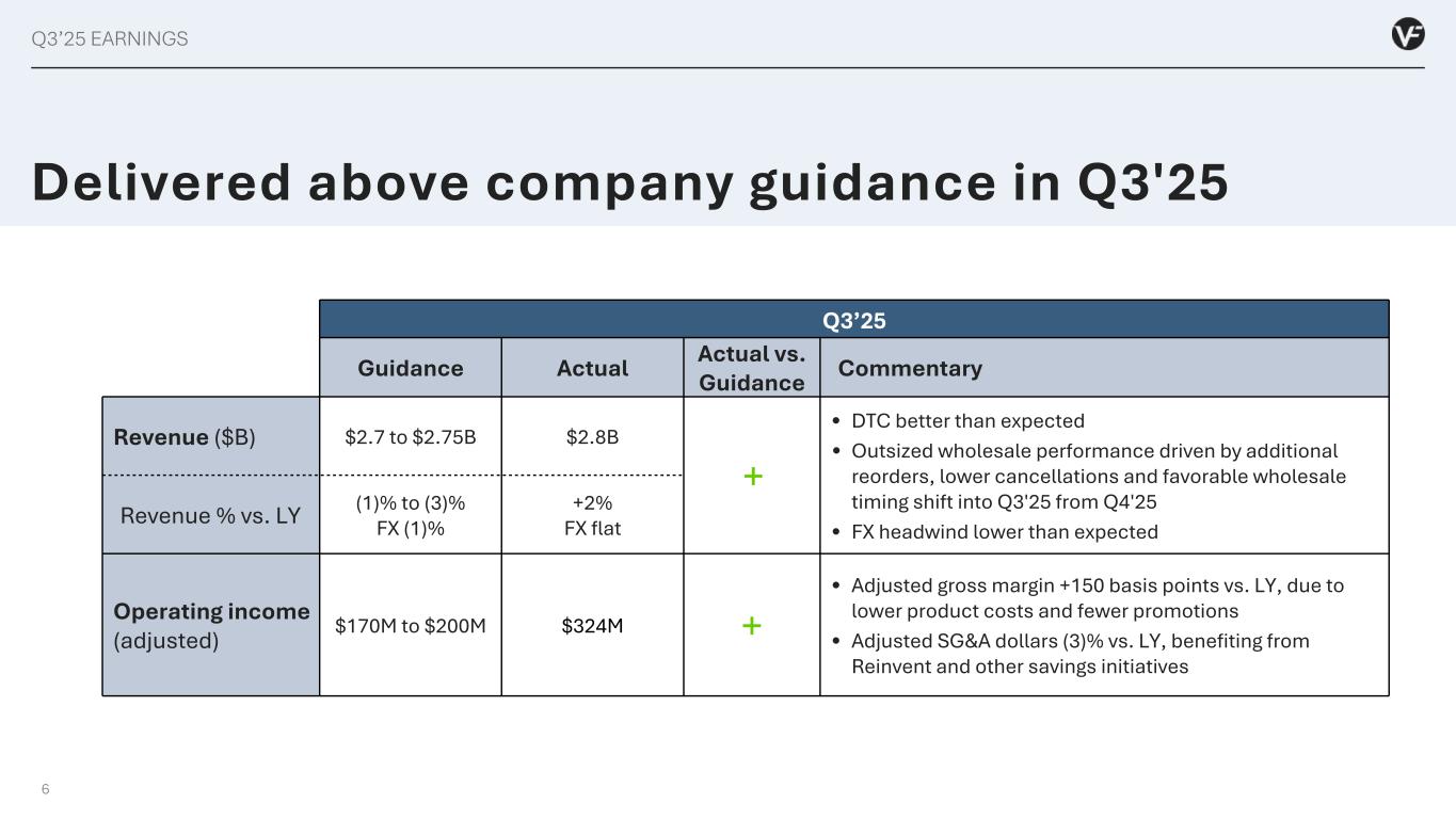 Strong progress in VF's transformation in Q3'25 Bracken Darrell, President and CEO: “We made strong progress in Q3'25, improving profitability and further strengthening the balance sheet. The pace of VF's transformation is on track as we deliver against our Reinvent priorities. Although there is work to do to consistently deliver double-digit operating margins and sustainable top-line growth, we are making great strides in transforming VF into a truly differentiated, multi-brand operator. We look forward to sharing more on the plans of our iconic brands at our upcoming Investor Day in March." 1 R$ and C$ 2 Guidance includes proceeds on sale of non-core physical assets Q3’25 EARNINGS 5 • Broad-based year-over-year improvement across key financials in Q3'25 – Revenue was $2.8 billion, up 2%1 vs. LY – All regions grew with global strength at The North Face® and Timberland®, while Vans® improved sequentially, as expected – Operating income was $226 million, adjusted operating income of $324 million – Operating margin was 8.0%, up 1,130 basis points vs. LY, and adjusted operating margin was 11.4%, up 360 basis points vs. LY – Gross margins expanded and year-to-date cost savings are progressing to plan – Earnings (loss) per share (EPS) $0.43 vs. Q3'24 $(0.24); adjusted EPS $0.62 vs. Q3'24 $0.45 – Net debt down $1.9 billion vs. LY, with net inventories (14)% vs. LY • Establishing Q4’25 guidance – Revenue (4)% to (6)% vs. LY, (2)% to (4)% C$ – Implies H2'25 revenue (1)% to (2)% vs. LY, flat to (1)% C$, showing progress relative to Q2'25 (6)%1 and Q1'25 (10)%1, both vs. LY – Adjusted operating loss of $(30) million to $0 million • Increasing FY'25 free cash flow guidance2 to $440 million – Relative to prior guidance of $425 million, this reflects higher than planned proceeds on sale of non-core physical assets and improved core fundamentals
