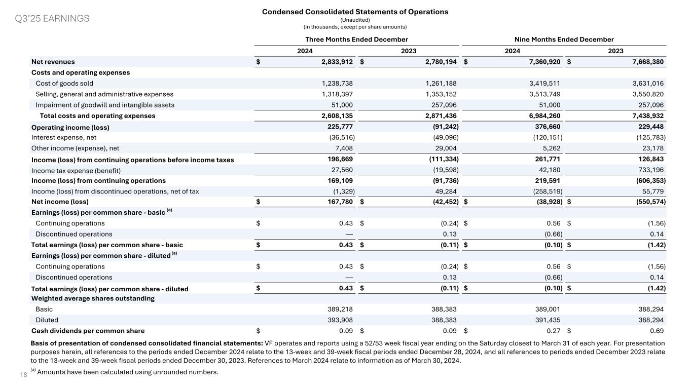 Three Months Ended December Nine Months Ended December 2024 2023 2024 2023 Net revenues $ 2,833,912 $ 2,780,194 $ 7,360,920 $ 7,668,380 Costs and operating expenses Cost of goods sold 1,238,738 1,261,188 3,419,511 3,631,016 Selling, general and administrative expenses 1,318,397 1,353,152 3,513,749 3,550,820 Impairment of goodwill and intangible assets 51,000 257,096 51,000 257,096 Total costs and operating expenses 2,608,135 2,871,436 6,984,260 7,438,932 Operating income (loss) 225,777 (91,242) 376,660 229,448 Interest expense, net (36,516) (49,096) (120,151) (125,783) Other income (expense), net 7,408 29,004 5,262 23,178 Income (loss) from continuing operations before income taxes 196,669 (111,334) 261,771 126,843 Income tax expense (benefit) 27,560 (19,598) 42,180 733,196 Income (loss) from continuing operations 169,109 (91,736) 219,591 (606,353) Income (loss) from discontinued operations, net of tax (1,329) 49,284 (258,519) 55,779 Net income (loss) $ 167,780 $ (42,452) $ (38,928) $ (550,574) Earnings (loss) per common share - basic (a) Continuing operations $ 0.43 $ (0.24) $ 0.56 $ (1.56) Discontinued operations — 0.13 (0.66) 0.14 Total earnings (loss) per common share - basic $ 0.43 $ (0.11) $ (0.10) $ (1.42) Earnings (loss) per common share - diluted (a) Continuing operations $ 0.43 $ (0.24) $ 0.56 $ (1.56) Discontinued operations — 0.13 (0.66) 0.14 Total earnings (loss) per common share - diluted $ 0.43 $ (0.11) $ (0.10) $ (1.42) Weighted average shares outstanding Basic 389,218 388,383 389,001 388,294 Diluted 393,908 388,383 391,435 388,294 Cash dividends per common share $ 0.09 $ 0.09 $ 0.27 $ 0.69 Condensed Consolidated Statements of Operations (Unaudited) (In thousands, except per share amounts) Basis of presentation of condensed consolidated financial statements: VF operates and reports using a 52/53 week fiscal year ending on the Saturday closest to March 31 of each year. For presentation purposes herein, all references to the periods ended December 2024 relate to the 13-week and 39-week fiscal periods ended December 28, 2024, and all references to periods ended December 2023 relate to the 13-week and 39-week fiscal periods ended December 30, 2023. References to March 2024 relate to information as of March 30, 2024. (a) Amounts have been calculated using unrounded numbers. Q3’25 EARNINGS 18