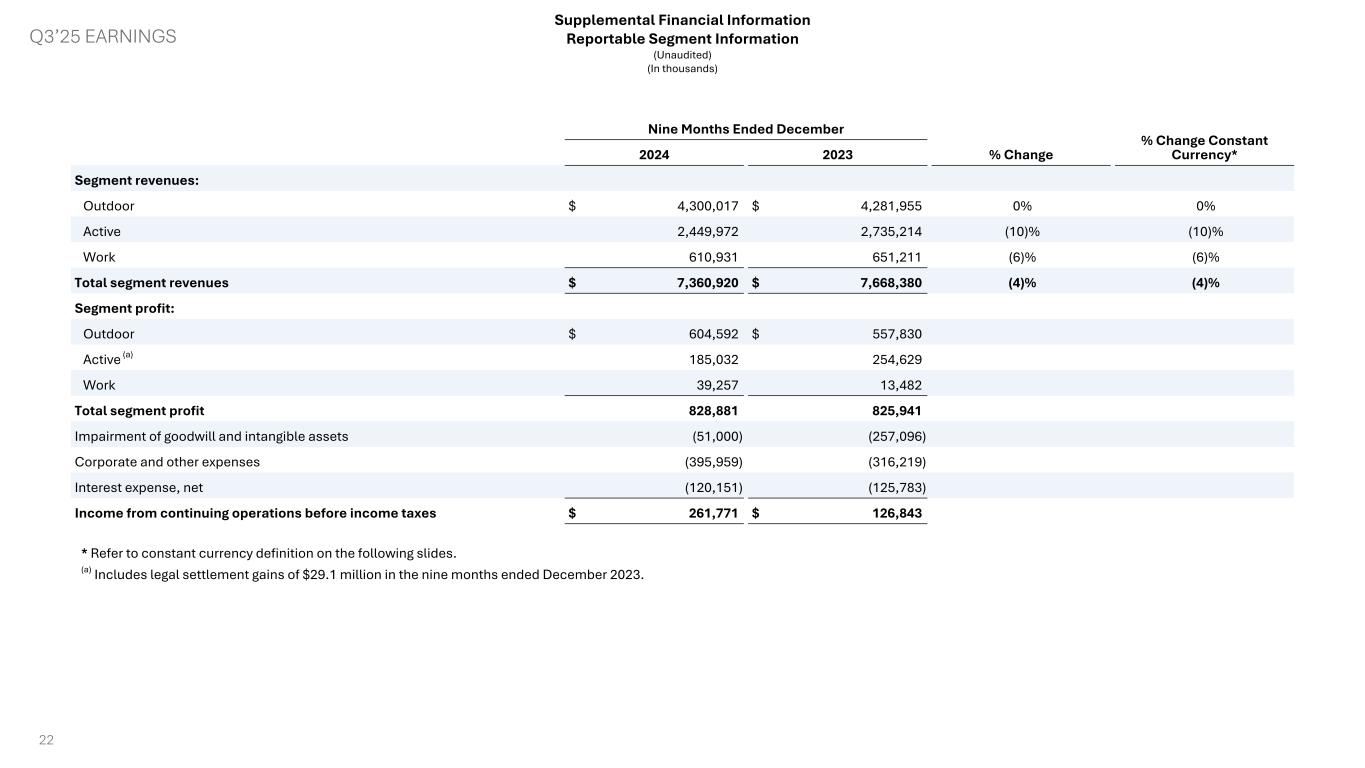 Three Months Ended December % Change Constant Currency*2024 2023 % Change Segment revenues: Outdoor $ 1,851,146 $ 1,738,579 6% 7% Active 766,307 819,307 (6)% (6)% Work 216,459 222,308 (3)% (2)% Total segment revenues $ 2,833,912 $ 2,780,194 2% 2% Segment profit (loss): Outdoor $ 400,593 $ 304,741 Active (a) 12,273 32,305 Work 13,521 (1,864) Total segment profit 426,387 335,182 Impairment of goodwill and intangible assets (51,000) (257,096) Corporate and other expenses (142,202) (140,324) Interest expense, net (36,516) (49,096) Income (loss) from continuing operations before income taxes $ 196,669 $ (111,334) Supplemental Financial Information Reportable Segment Information (Unaudited) (In thousands) * Refer to constant currency definition on the following slides. (a) Includes legal settlement gains of $29.1 million in the three months ended December 2023. Q3’25 EARNINGS 21