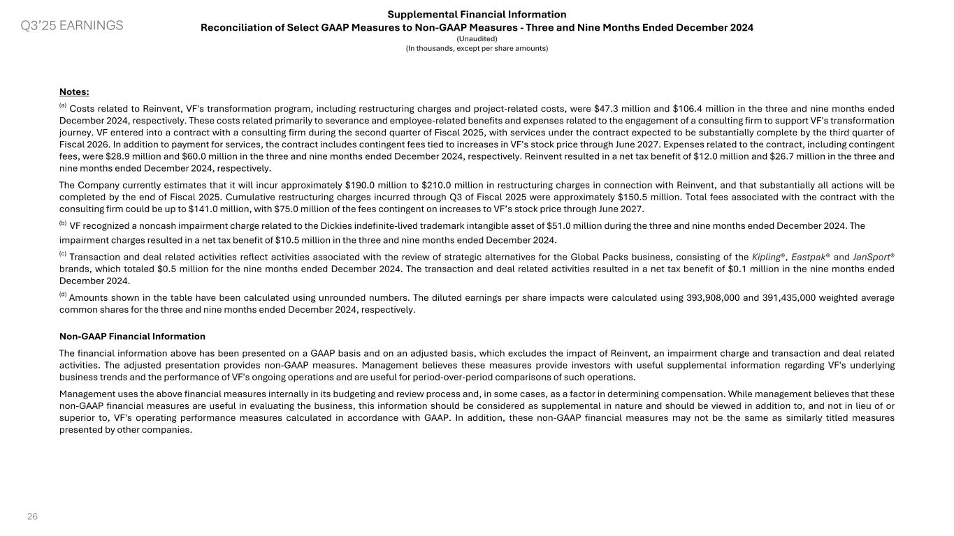 Notes: (a) Costs related to Reinvent, VF's transformation program, including restructuring charges and project-related costs, were $47.3 million and $106.4 million in the three and nine months ended December 2024, respectively. These costs related primarily to severance and employee-related benefits and expenses related to the engagement of a consulting firm to support VF's transformation journey. VF entered into a contract with a consulting firm during the second quarter of Fiscal 2025, with services under the contract expected to be substantially complete by the third quarter of Fiscal 2026. In addition to payment for services, the contract includes contingent fees tied to increases in VF's stock price through June 2027. Expenses related to the contract, including contingent fees, were $28.9 million and $60.0 million in the three and nine months ended December 2024, respectively. Reinvent resulted in a net tax benefit of $12.0 million and $26.7 million in the three and nine months ended December 2024, respectively. The Company currently estimates that it will incur approximately $190.0 million to $210.0 million in restructuring charges in connection with Reinvent, and that substantially all actions will be completed by the end of Fiscal 2025. Cumulative restructuring charges incurred through Q3 of Fiscal 2025 were approximately $150.5 million. Total fees associated with the contract with the consulting firm could be up to $141.0 million, with $75.0 million of the fees contingent on increases to VF’s stock price through June 2027. (b) VF recognized a noncash impairment charge related to the Dickies indefinite-lived trademark intangible asset of $51.0 million during the three and nine months ended December 2024. The impairment charges resulted in a net tax benefit of $10.5 million in the three and nine months ended December 2024. (c) Transaction and deal related activities reflect activities associated with the review of strategic alternatives for the Global Packs business, consisting of the Kipling®, Eastpak® and JanSport® brands, which totaled $0.5 million for the nine months ended December 2024. The transaction and deal related activities resulted in a net tax benefit of $0.1 million in the nine months ended December 2024. (d) Amounts shown in the table have been calculated using unrounded numbers. The diluted earnings per share impacts were calculated using 393,908,000 and 391,435,000 weighted average common shares for the three and nine months ended December 2024, respectively. Non-GAAP Financial Information The financial information above has been presented on a GAAP basis and on an adjusted basis, which excludes the impact of Reinvent, an impairment charge and transaction and deal related activities. The adjusted presentation provides non-GAAP measures. Management believes these measures provide investors with useful supplemental information regarding VF's underlying business trends and the performance of VF's ongoing operations and are useful for period-over-period comparisons of such operations. Management uses the above financial measures internally in its budgeting and review process and, in some cases, as a factor in determining compensation. While management believes that these non-GAAP financial measures are useful in evaluating the business, this information should be considered as supplemental in nature and should be viewed in addition to, and not in lieu of or superior to, VF's operating performance measures calculated in accordance with GAAP. In addition, these non-GAAP financial measures may not be the same as similarly titled measures presented by other companies. Q3’25 EARNINGS 26 Supplemental Financial Information Reconciliation of Select GAAP Measures to Non-GAAP Measures - Three and Nine Months Ended December 2024 (Unaudited) (In thousands, except per share amounts)