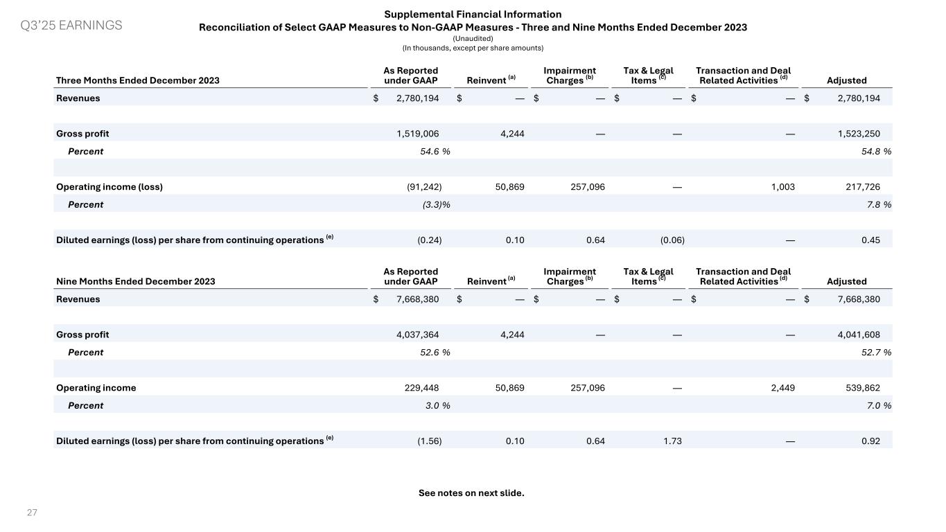 Three Months Ended December 2023 As Reported under GAAP Reinvent (a) Impairment Charges (b) Tax & Legal Items (c) Transaction and Deal Related Activities (d) Adjusted Revenues $ 2,780,194 $ — $ — $ — $ — $ 2,780,194 Gross profit 1,519,006 4,244 — — — 1,523,250 Percent 54.6 % 54.8 % Operating income (loss) (91,242) 50,869 257,096 — 1,003 217,726 Percent (3.3) % 7.8 % Diluted earnings (loss) per share from continuing operations (e) (0.24) 0.10 0.64 (0.06) — 0.45 Nine Months Ended December 2023 As Reported under GAAP Reinvent (a) Impairment Charges (b) Tax & Legal Items (c) Transaction and Deal Related Activities (d) Adjusted Revenues $ 7,668,380 $ — $ — $ — $ — $ 7,668,380 Gross profit 4,037,364 4,244 — — — 4,041,608 Percent 52.6 % 52.7 % Operating income 229,448 50,869 257,096 — 2,449 539,862 Percent 3.0 % 7.0 % Diluted earnings (loss) per share from continuing operations (e) (1.56) 0.10 0.64 1.73 — 0.92 Q3’25 EARNINGS 27 See notes on next slide. Supplemental Financial Information Reconciliation of Select GAAP Measures to Non-GAAP Measures - Three and Nine Months Ended December 2023 (Unaudited) (In thousands, except per share amounts)