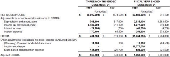 WidePoint uses a variety of operational and financial metrics, including non-GAAP financial measures such as EBITDA and Adjusted EBITDA, to enable it to analyze its performance and financial condition. The presentation of non-GAAP financial information should not be considered in isolation or as a substitute for, or superior to, the financial information prepared and presented in accordance with GAAP. A reconciliation of GAAP Net income to EBITDA and Adjusted EBITDA is provided below: