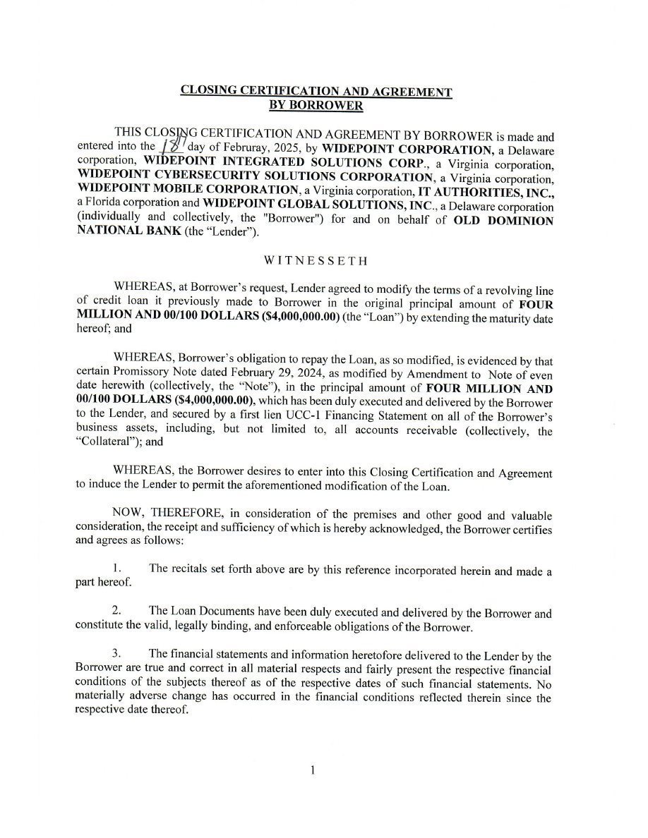 EX-10.3 4 wyy_ex103.htm CLOSING CERTIFICATION AND AGREEMENT wyy_ex103.htm