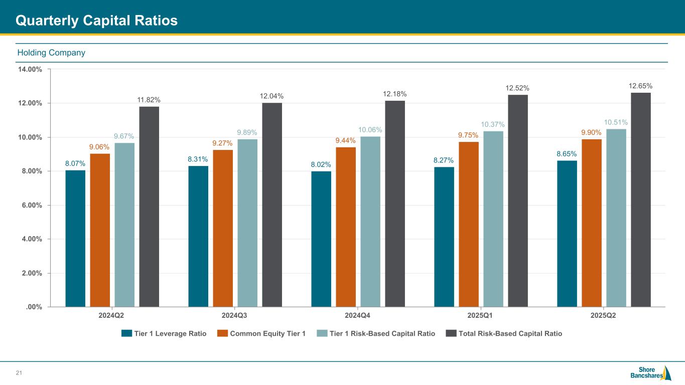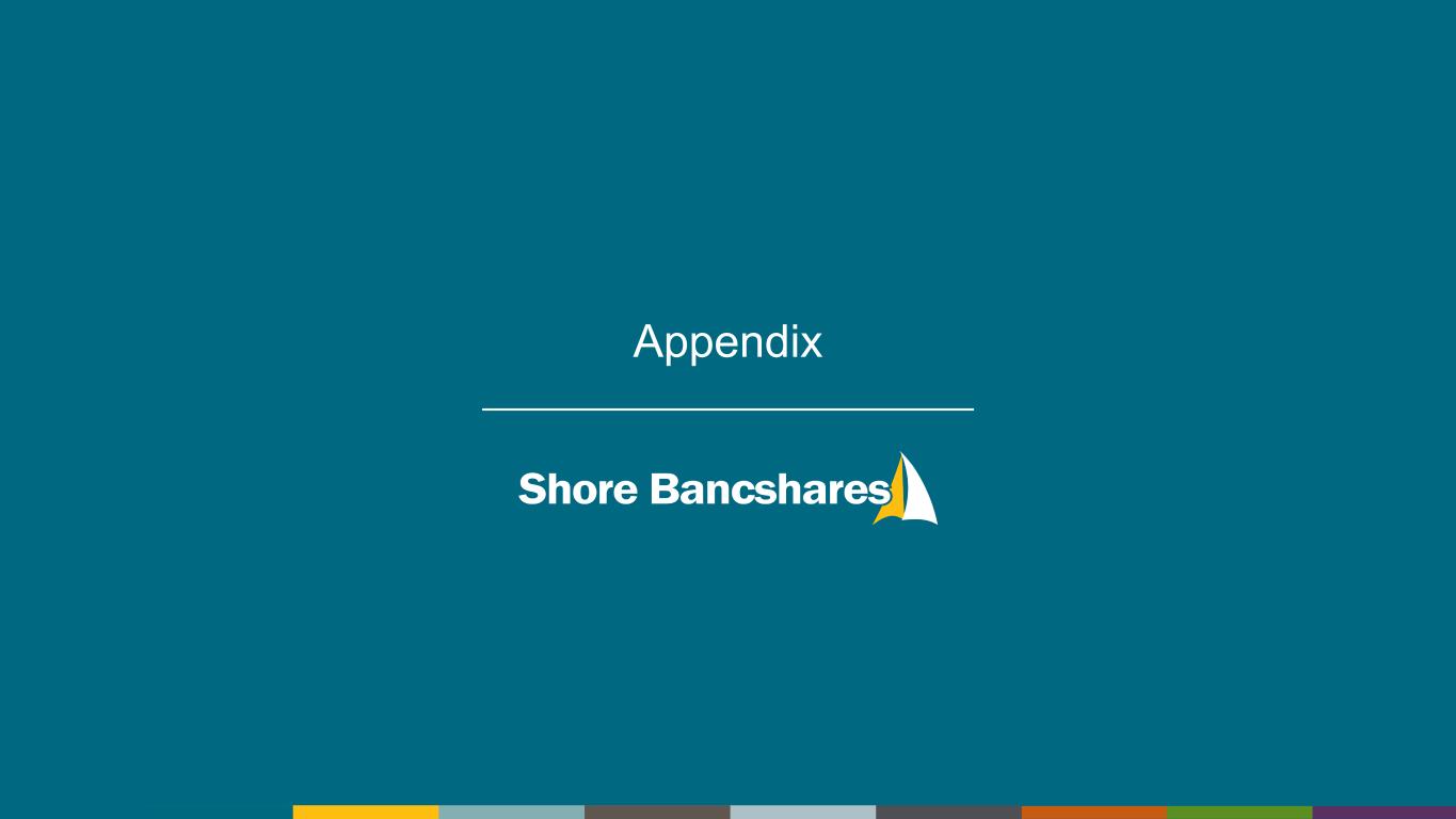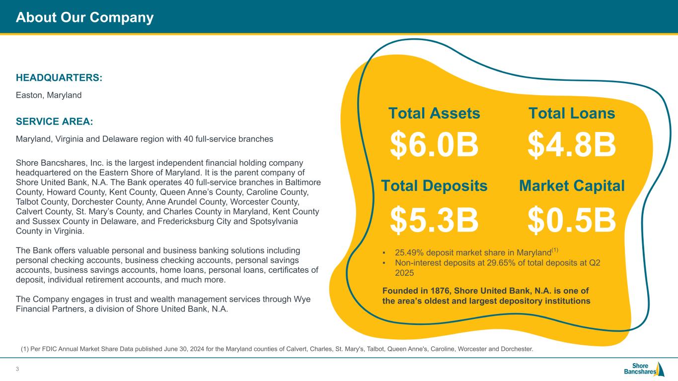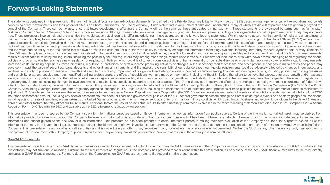 #006881 #ACC0C6 #83AFB4 #FEBE10 #5F574F #4D4F53 #C75B12 #5B8F22 #593160 Forward-Looking Statements The statements contained in this presentation that are not historical facts are forward-looking statements (as defined by the Private Securities Litigation Reform Act of 1995) based on management’s current expectations and beliefs concerning future developments and their potential effects on Shore Bancshares, Inc. (the “Company”). Such statements involve inherent risks and uncertainties, many of which are difficult to predict and are generally beyond the control of the Company. There can be no assurance that future developments affecting the Company will be the same as those anticipated by management. These statements are evidenced by terms such as “anticipate,” “estimate,” “should,” “expect,” “believe,” “intend,” and similar expressions. Although these statements reflect management’s good faith beliefs and projections, they are not guarantees of future performance and they may not prove true. These projections involve risk and uncertainties that could cause actual results to differ materially from those addressed in the forward-looking statements. While there is no assurance that any list of risks and uncertainties or risk factors is complete, below are certain factors which could cause actual results to differ materially from those contained or implied in the forward-looking statements: the strength of the United States ("U.S.") economy and general economic conditions, (including the interest rate environment, government economic and monetary policies, the strength of global financial markets and inflation/deflation and supply chain issues), whether national or regional, and conditions in the lending markets in which we participate that may have an adverse effect on the demand for our loans and other products, our credit quality and related levels of nonperforming assets and loan losses, and the value and salability of the real estate that we own or that is the collateral for our loans; the ability to effectively manage the information technology systems, including third-party vendors, cyber or data privacy incidents or other failures, disruptions or security breaches, and risk related to the development and use of artificial intelligence; the ability to develop and use technologies to provide products and services that will satisfy customer demands; results of examinations of us by our regulators, including the possibility that our regulators may, among other things, require us to increase our reserve for loan losses or to write-down assets; changing bank regulatory conditions, policies or programs, whether arising as new legislation or regulatory initiatives, which could lead to restrictions on activities of banks generally, or our subsidiary bank in particular, more restrictive regulatory capital requirements, increased costs, including deposit insurance premiums, regulation or prohibition of certain income producing activities or changes in the secondary market for loans and other products; changes in market rates and prices may adversely impact the value of securities, loans, deposits and other financial instruments and the interest rate sensitivity of our balance sheet; our liquidity requirements could be adversely affected by changes in our assets and liabilities; our ability to prudently manage our growth and execute our strategy; impairment of our goodwill and intangible assets; competitive factors among financial services organizations, including product and pricing pressures and our ability to attract, develop and retain qualified banking professionals; the effect of acquisitions we have made or may make, including, without limitation, the failure to achieve the expected revenue growth and/or expense savings from such acquisitions, and/or the failure to effectively integrate an acquisition target into our operations; the growth and profitability of noninterest or fee income being less than expected; the effect of legislative or regulatory developments, including changes in laws concerning taxes, banking, securities, insurance and other aspects of the financial services industry; the effect of any change in federal government enforcement of federal laws affecting the cannabis industry; the effect of changes in accounting policies and practices, as may be adopted by the Financial Accounting Standards Board, the U.S. Securities and Exchange Commission (the “SEC”), the Public Company Accounting Oversight Board and other regulatory agencies; changes in U.S. trade policies, including the implementation of tariffs and other protectionist trade policies; the impact of governmental efforts to restructure or adjust the U.S. financial regulatory system; the impact of recent or future changes in Federal Deposit Insurance Corporation (the “FDIC”) insurance assessment rate or the rules and regulations related to the calculation of the FDIC insurance assessment amount, including any special assessments; the effect of fiscal and governmental policies of the U.S. federal government; climate change and other catastrophic events or disasters; geopolitical conditions, including acts or threats of terrorism, actions taken by the United States or other governments in response to acts of terrorism, and/or military conflicts, which could impact business and economic conditions in the United States and abroad; and other factors that may affect our future results. Additional factors that could cause actual results to differ materially from those expressed in the forward-looking statements are discussed in the Company’s 2024 Annual Report on Form 10-K filed with the SEC and available at the SEC’s Internet site (https://www.sec.gov). This presentation has been prepared by the Company solely for informational purposes based on its own information, as well as information from public sources. Certain of the information contained herein may be derived from informati
