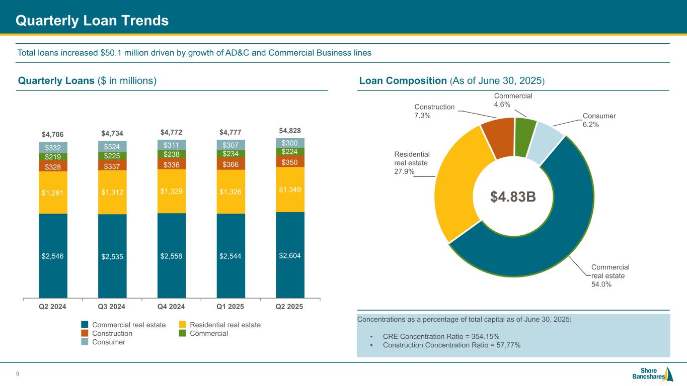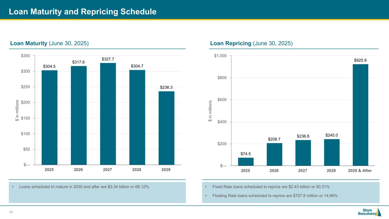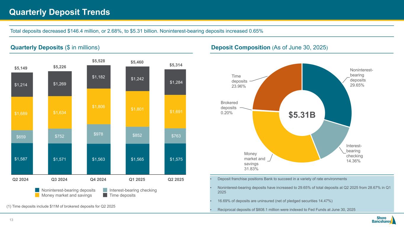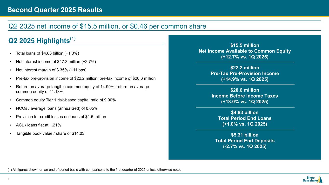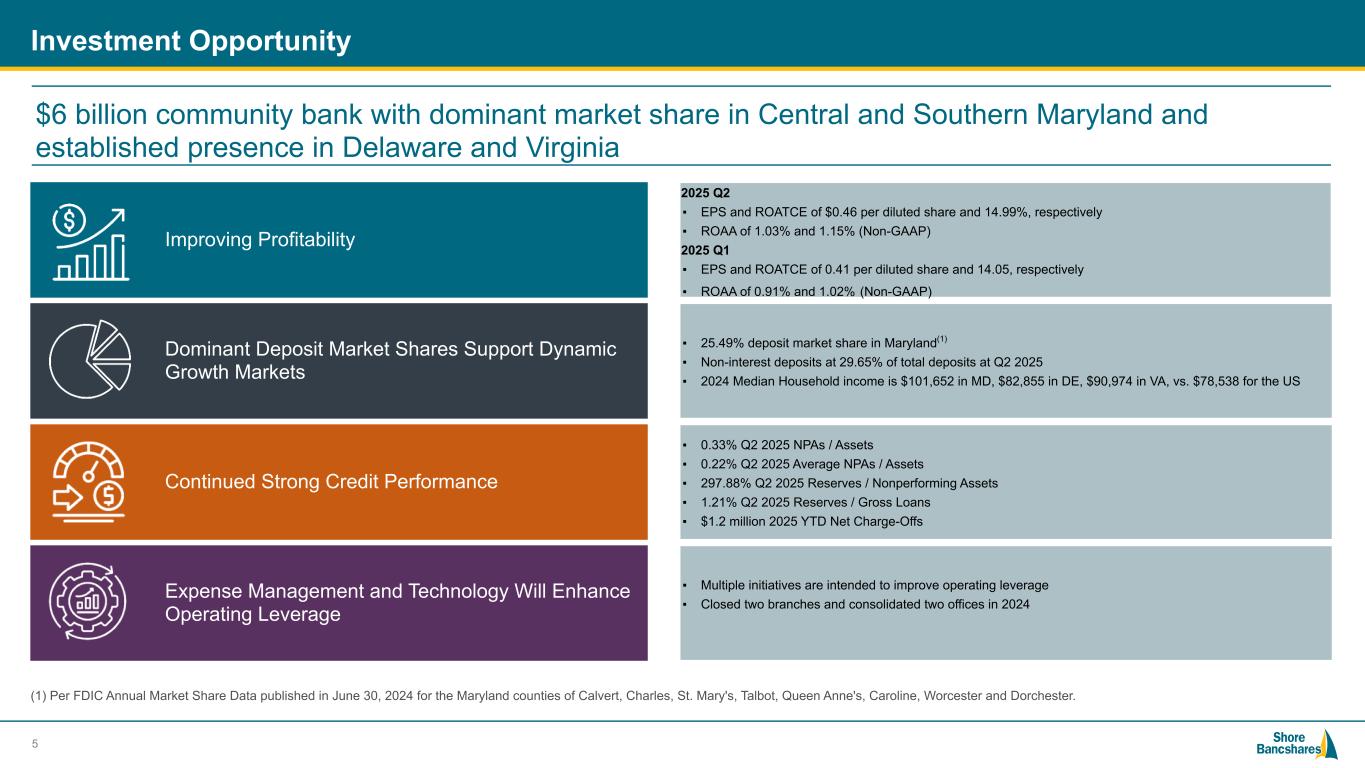 #006881 #ACC0C6 #83AFB4 #FEBE10 #5F574F #4D4F53 #C75B12 #5B8F22 #593160 Forward-Looking Statements The statements contained in this presentation that are not historical facts are forward-looking statements (as defined by the Private Securities Litigation Reform Act of 1995) based on management’s current expectations and beliefs concerning future developments and their potential effects on Shore Bancshares, Inc. (the “Company”). Such statements involve inherent risks and uncertainties, many of which are difficult to predict and are generally beyond the control of the Company. There can be no assurance that future developments affecting the Company will be the same as those anticipated by management. These statements are evidenced by terms such as “anticipate,” “estimate,” “should,” “expect,” “believe,” “intend,” and similar expressions. Although these statements reflect management’s good faith beliefs and projections, they are not guarantees of future performance and they may not prove true. These projections involve risk and uncertainties that could cause actual results to differ materially from those addressed in the forward-looking statements. While there is no assurance that any list of risks and uncertainties or risk factors is complete, below are certain factors which could cause actual results to differ materially from those contained or implied in the forward-looking statements: the strength of the United States ("U.S.") economy and general economic conditions, (including the interest rate environment, government economic and monetary policies, the strength of global financial markets and inflation/deflation and supply chain issues), whether national or regional, and conditions in the lending markets in which we participate that may have an adverse effect on the demand for our loans and other products, our credit quality and related levels of nonperforming assets and loan losses, and the value and salability of the real estate that we own or that is the collateral for our loans; the ability to effectively manage the information technology systems, including third-party vendors, cyber or data privacy incidents or other failures, disruptions or security breaches, and risk related to the development and use of artificial intelligence; the ability to develop and use technologies to provide products and services that will satisfy customer demands; results of examinations of us by our regulators, including the possibility that our regulators may, among other things, require us to increase our reserve for loan losses or to write-down assets; changing bank regulatory conditions, policies or programs, whether arising as new legislation or regulatory initiatives, which could lead to restrictions on activities of banks generally, or our subsidiary bank in particular, more restrictive regulatory capital requirements, increased costs, including deposit insurance premiums, regulation or prohibition of certain income producing activities or changes in the secondary market for loans and other products; changes in market rates and prices may adversely impact the value of securities, loans, deposits and other financial instruments and the interest rate sensitivity of our balance sheet; our liquidity requirements could be adversely affected by changes in our assets and liabilities; our ability to prudently manage our growth and execute our strategy; impairment of our goodwill and intangible assets; competitive factors among financial services organizations, including product and pricing pressures and our ability to attract, develop and retain qualified banking professionals; the effect of acquisitions we have made or may make, including, without limitation, the failure to achieve the expected revenue growth and/or expense savings from such acquisitions, and/or the failure to effectively integrate an acquisition target into our operations; the growth and profitability of noninterest or fee income being less than expected; the effect of legislative or regulatory developments, including changes in laws concerning taxes, banking, securities, insurance and other aspects of the financial services industry; the effect of any change in federal government enforcement of federal laws affecting the cannabis industry; the effect of changes in accounting policies and practices, as may be adopted by the Financial Accounting Standards Board, the U.S. Securities and Exchange Commission (the “SEC”), the Public Company Accounting Oversight Board and other regulatory agencies; changes in U.S. trade policies, including the implementation of tariffs and other protectionist trade policies; the impact of governmental efforts to restructure or adjust the U.S. financial regulatory system; the impact of recent or future changes in Federal Deposit Insurance Corporation (the “FDIC”) insurance assessment rate or the rules and regulations related to the calculation of the FDIC insurance assessment amount, including any special assessments; the effect of fiscal and governmental policies of the U.S. federal government; climate change and other catastrophic events or disasters; geopolitical conditions, including acts or threats of terrorism, actions taken by the United States or other governments in response to acts of terrorism, and/or military conflicts, which could impact business and economic conditions in the United States and abroad; and other factors that may affect our future results. Additional factors that could cause actual results to differ materially from those expressed in the forward-looking statements are discussed in the Company’s 2024 Annual Report on Form 10-K filed with the SEC and available at the SEC’s Internet site (https://www.sec.gov). This presentation has been prepared by the Company solely for informational purposes based on its own information, as well as information from public sources. Certain of the information contained herein may be derived from informati