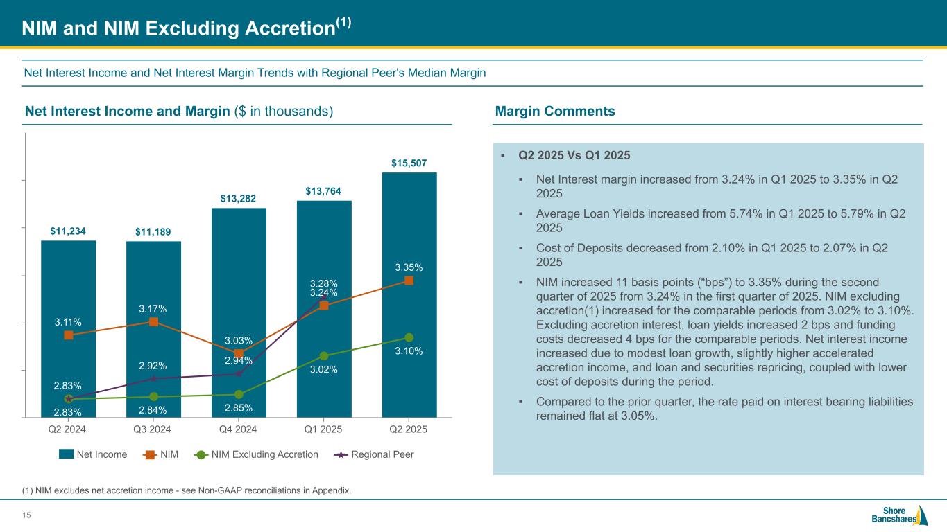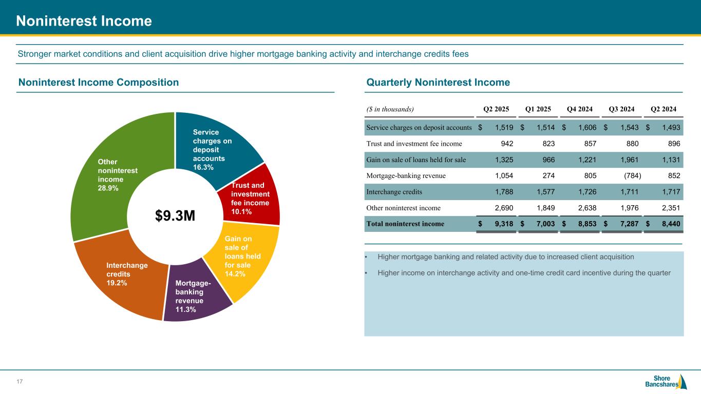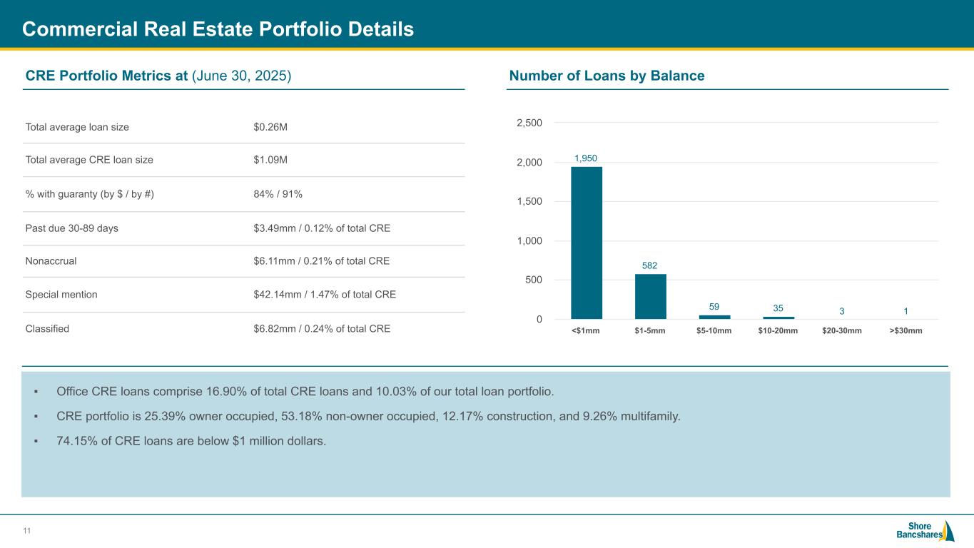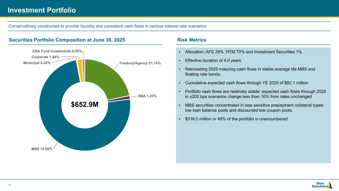 #006881 #ACC0C6 #83AFB4 #FEBE10 #5F574F #4D4F53 #C75B12 #5B8F22 #593160 Forward-Looking Statements The statements contained in this presentation that are not historical facts are forward-looking statements (as defined by the Private Securities Litigation Reform Act of 1995) based on management’s current expectations and beliefs concerning future developments and their potential effects on Shore Bancshares, Inc. (the “Company”). Such statements involve inherent risks and uncertainties, many of which are difficult to predict and are generally beyond the control of the Company. There can be no assurance that future developments affecting the Company will be the same as those anticipated by management. These statements are evidenced by terms such as “anticipate,” “estimate,” “should,” “expect,” “believe,” “intend,” and similar expressions. Although these statements reflect management’s good faith beliefs and projections, they are not guarantees of future performance and they may not prove true. These projections involve risk and uncertainties that could cause actual results to differ materially from those addressed in the forward-looking statements. While there is no assurance that any list of risks and uncertainties or risk factors is complete, below are certain factors which could cause actual results to differ materially from those contained or implied in the forward-looking statements: the strength of the United States ("U.S.") economy and general economic conditions, (including the interest rate environment, government economic and monetary policies, the strength of global financial markets and inflation/deflation and supply chain issues), whether national or regional, and conditions in the lending markets in which we participate that may have an adverse effect on the demand for our loans and other products, our credit quality and related levels of nonperforming assets and loan losses, and the value and salability of the real estate that we own or that is the collateral for our loans; the ability to effectively manage the information technology systems, including third-party vendors, cyber or data privacy incidents or other failures, disruptions or security breaches, and risk related to the development and use of artificial intelligence; the ability to develop and use technologies to provide products and services that will satisfy customer demands; results of examinations of us by our regulators, including the possibility that our regulators may, among other things, require us to increase our reserve for loan losses or to write-down assets; changing bank regulatory conditions, policies or programs, whether arising as new legislation or regulatory initiatives, which could lead to restrictions on activities of banks generally, or our subsidiary bank in particular, more restrictive regulatory capital requirements, increased costs, including deposit insurance premiums, regulation or prohibition of certain income producing activities or changes in the secondary market for loans and other products; changes in market rates and prices may adversely impact the value of securities, loans, deposits and other financial instruments and the interest rate sensitivity of our balance sheet; our liquidity requirements could be adversely affected by changes in our assets and liabilities; our ability to prudently manage our growth and execute our strategy; impairment of our goodwill and intangible assets; competitive factors among financial services organizations, including product and pricing pressures and our ability to attract, develop and retain qualified banking professionals; the effect of acquisitions we have made or may make, including, without limitation, the failure to achieve the expected revenue growth and/or expense savings from such acquisitions, and/or the failure to effectively integrate an acquisition target into our operations; the growth and profitability of noninterest or fee income being less than expected; the effect of legislative or regulatory developments, including changes in laws concerning taxes, banking, securities, insurance and other aspects of the financial services industry; the effect of any change in federal government enforcement of federal laws affecting the cannabis industry; the effect of changes in accounting policies and practices, as may be adopted by the Financial Accounting Standards Board, the U.S. Securities and Exchange Commission (the “SEC”), the Public Company Accounting Oversight Board and other regulatory agencies; changes in U.S. trade policies, including the implementation of tariffs and other protectionist trade policies; the impact of governmental efforts to restructure or adjust the U.S. financial regulatory system; the impact of recent or future changes in Federal Deposit Insurance Corporation (the “FDIC”) insurance assessment rate or the rules and regulations related to the calculation of the FDIC insurance assessment amount, including any special assessments; the effect of fiscal and governmental policies of the U.S. federal government; climate change and other catastrophic events or disasters; geopolitical conditions, including acts or threats of terrorism, actions taken by the United States or other governments in response to acts of terrorism, and/or military conflicts, which could impact business and economic conditions in the United States and abroad; and other factors that may affect our future results. Additional factors that could cause actual results to differ materially from those expressed in the forward-looking statements are discussed in the Company’s 2024 Annual Report on Form 10-K filed with the SEC and available at the SEC’s Internet site (https://www.sec.gov). This presentation has been prepared by the Company solely for informational purposes based on its own information, as well as information from public sources. Certain of the information contained herein may be derived from informati