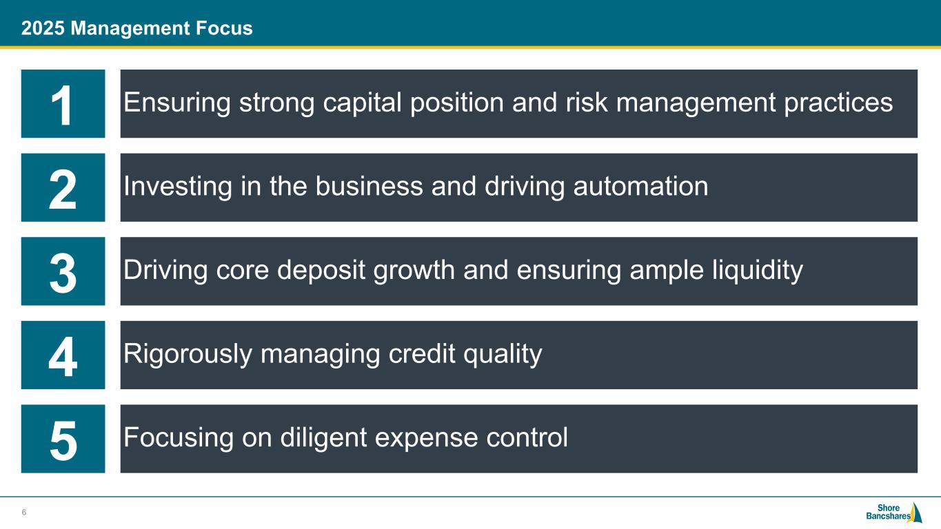 #006881 #ACC0C6 #83AFB4 #FEBE10 #5F574F #4D4F53 #C75B12 #5B8F22 #593160 2025 Management Focus 6 1 Ensuring strong capital position and risk management practices 2 Investing in the business and driving automation 3 Driving core deposit growth and ensuring ample liquidity 4 Rigorously managing credit quality 5 Focusing on diligent expense control