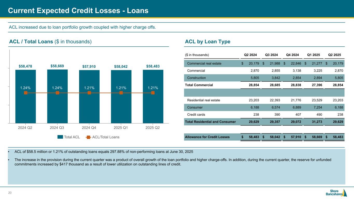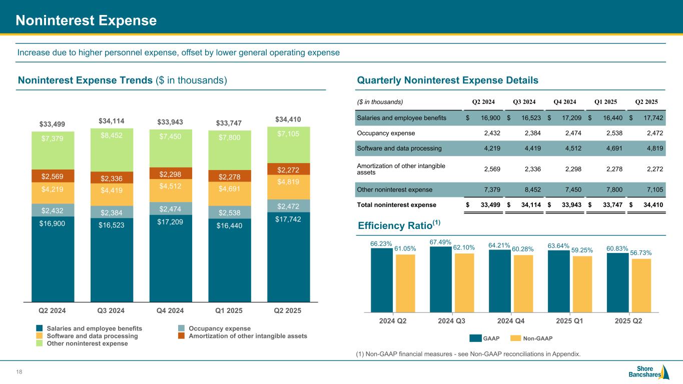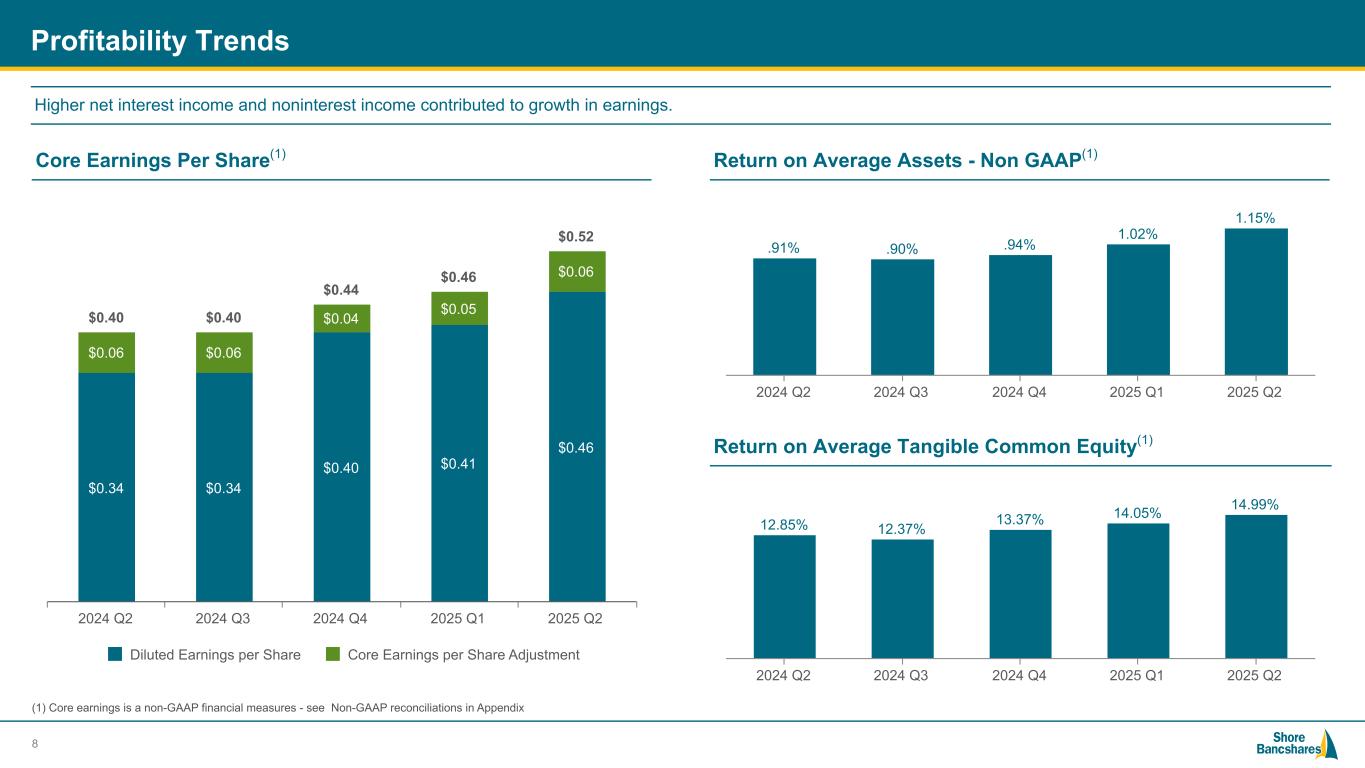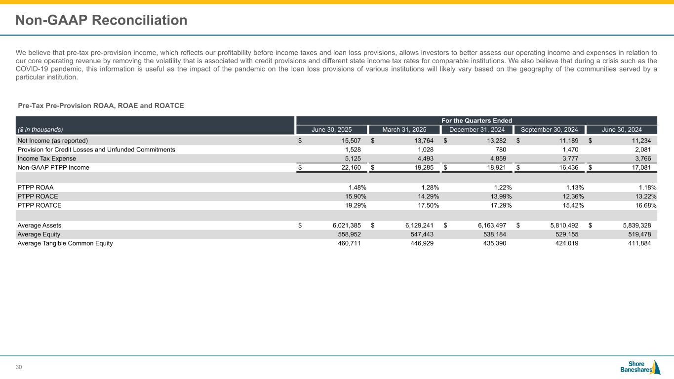 #006881 #ACC0C6 #83AFB4 #FEBE10 #5F574F #4D4F53 #C75B12 #5B8F22 #593160 Non-GAAP Reconciliation We believe that pre-tax pre-provision income, which reflects our profitability before income taxes and loan loss provisions, allows investors to better assess our operating income and expenses in relation to our core operating revenue by removing the volatility that is associated with credit provisions and different state income tax rates for comparable institutions. We also believe that during a crisis such as the COVID-19 pandemic, this information is useful as the impact of the pandemic on the loan loss provisions of various institutions will likely vary based on the geography of the communities served by a particular institution. Pre-Tax Pre-Provision ROAA, ROAE and ROATCE ($ in thousands) For the Quarters Ended June 30, 2025 March 31, 2025 December 31, 2024 September 30, 2024 June 30, 2024 Net Income (as reported) $ 15,507 $ 13,764 $ 13,282 $ 11,189 $ 11,234 Provision for Credit Losses and Unfunded Commitments 1,528 1,028 780 1,470 2,081 Income Tax Expense 5,125 4,493 4,859 3,777 3,766 Non-GAAP PTPP Income $ 22,160 $ 19,285 $ 18,921 $ 16,436 $ 17,081 PTPP ROAA 1.48 % 1.28 % 1.22 % 1.13 % 1.18 % PTPP ROACE 15.90 % 14.29 % 13.99 % 12.36 % 13.22 % PTPP ROATCE 19.29 % 17.50 % 17.29 % 15.42 % 16.68 % Average Assets $ 6,021,385 $ 6,129,241 $ 6,163,497 $ 5,810,492 $ 5,839,328 Average Equity 558,952 547,443 538,184 529,155 519,478 Average Tangible Common Equity 460,711 446,929 435,390 424,019 411,884 30