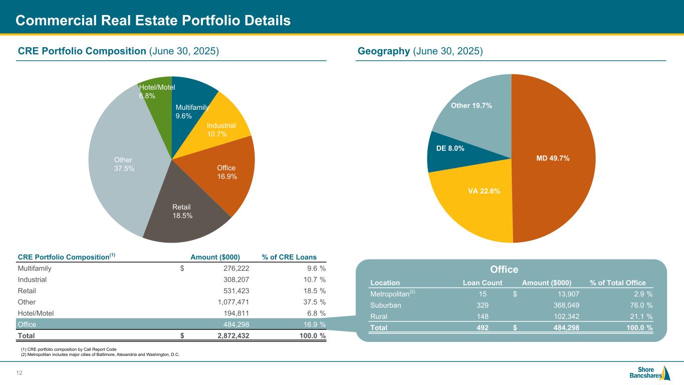 #006881 #ACC0C6 #83AFB4 #FEBE10 #5F574F #4D4F53 #C75B12 #5B8F22 #593160 Commercial Real Estate Portfolio Details Total average loan size $0.26M Total average CRE loan size $1.09M % with guaranty (by $ / by #) 84% / 91% Past due 30-89 days $3.49mm / 0.12% of total CRE Nonaccrual $6.11mm / 0.21% of total CRE Special mention $42.14mm / 1.47% of total CRE Classified $6.82mm / 0.24% of total CRE 1,950 582 59 35 3 1 <$1mm $1-5mm $5-10mm $10-20mm $20-30mm >$30mm 0 500 1,000 1,500 2,000 2,500 ▪ Office CRE loans comprise 16.90% of total CRE loans and 10.03% of our total loan portfolio. ▪ CRE portfolio is 25.39% owner occupied, 53.18% non-owner occupied, 12.17% construction, and 9.26% multifamily. ▪ 74.15% of CRE loans are below $1 million dollars. 11 CRE Portfolio Metrics at (June 30, 2025) Number of Loans by Balance