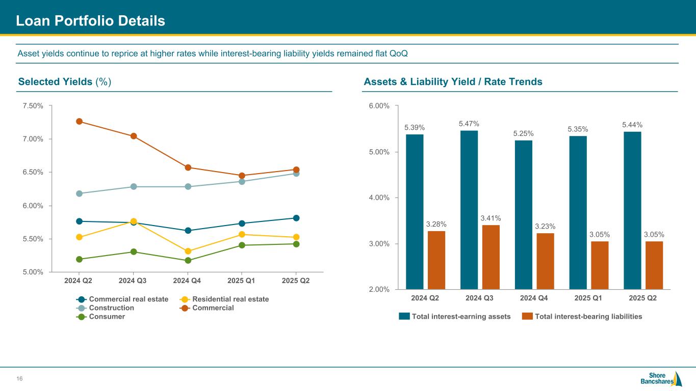 #006881 #ACC0C6 #83AFB4 #FEBE10 #5F574F #4D4F53 #C75B12 #5B8F22 #593160 $11,234 $11,189 $13,282 $13,764 $15,507 3.11% 3.17% 3.03% 3.24% 3.35% 2.83% 2.84% 2.85% 3.02% 3.10% 2.83% 2.92% 2.94% 3.28% Net Income NIM NIM Excluding Accretion Regional Peer Q2 2024 Q3 2024 Q4 2024 Q1 2025 Q2 2025 NIM and NIM Excluding Accretion(1) (1) NIM excludes net accretion income - see Non-GAAP reconciliations in Appendix. 15 Net Interest Income and Margin ($ in thousands) Margin Comments Net Interest Income and Net Interest Margin Trends with Regional Peer's Median Margin ▪ Q2 2025 Vs Q1 2025 ▪ Net Interest margin increased from 3.24% in Q1 2025 to 3.35% in Q2 2025 ▪ Average Loan Yields increased from 5.74% in Q1 2025 to 5.79% in Q2 2025 ▪ Cost of Deposits decreased from 2.10% in Q1 2025 to 2.07% in Q2 2025 ▪ NIM increased 11 basis points (“bps”) to 3.35% during the second quarter of 2025 from 3.24% in the first quarter of 2025. NIM excluding accretion(1) increased for the comparable periods from 3.02% to 3.10%. Excluding accretion interest, loan yields increased 2 bps and funding costs decreased 4 bps for the comparable periods. Net interest income increased due to modest loan growth, slightly higher accelerated accretion income, and loan and securities repricing, coupled with lower cost of deposits during the period. ▪ Compared to the prior quarter, the rate paid on interest bearing liabilities remained flat at 3.05%.