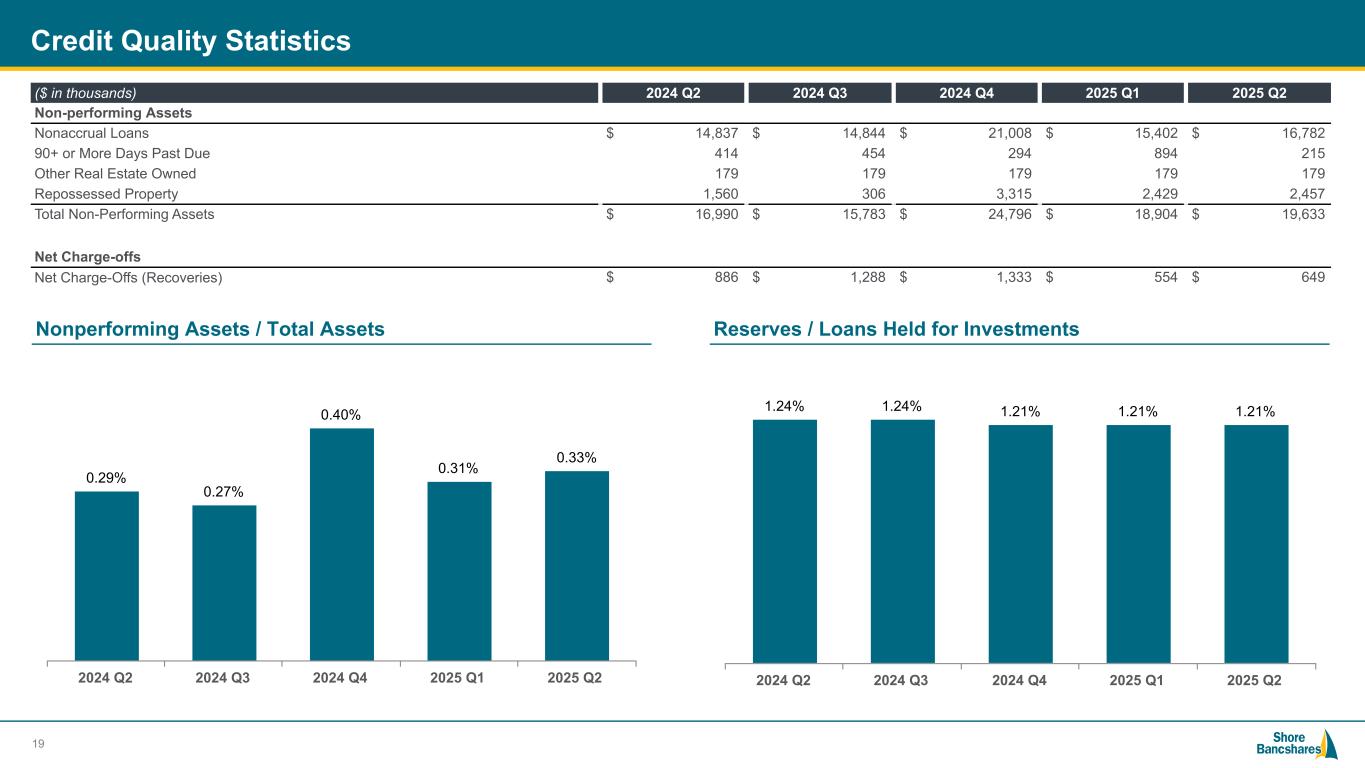 #006881 #ACC0C6 #83AFB4 #FEBE10 #5F574F #4D4F53 #C75B12 #5B8F22 #593160 Noninterest Expense 18 Noninterest Expense Trends ($ in thousands) Quarterly Noninterest Expense Details Increase due to higher personnel expense, offset by lower general operating expense ($ in thousands) Q2 2024 Q3 2024 Q4 2024 Q1 2025 Q2 2025 Salaries and employee benefits $ 16,900 $ 16,523 $ 17,209 $ 16,440 $ 17,742 Occupancy expense 2,432 2,384 2,474 2,538 2,472 Software and data processing 4,219 4,419 4,512 4,691 4,819 Amortization of other intangible assets 2,569 2,336 2,298 2,278 2,272 Other noninterest expense 7,379 8,452 7,450 7,800 7,105 Total noninterest expense $ 33,499 $ 34,114 $ 33,943 $ 33,747 $ 34,410 Efficiency Ratio(1) $33,499 $34,114 $33,943 $33,747 $34,410 $16,900 $16,523 $17,209 $16,440 $17,742 $2,432 $2,384 $2,474 $2,538 $2,472 $4,219 $4,419 $4,512 $4,691 $4,819 $2,569 $2,336 $2,298 $2,278 $2,272 $7,379 $8,452 $7,450 $7,800 $7,105 Salaries and employee benefits Occupancy expense Software and data processing Amortization of other intangible assets Other noninterest expense Q2 2024 Q3 2024 Q4 2024 Q1 2025 Q2 2025 66.23% 67.49% 64.21% 63.64% 60.83%61.05% 62.10% 60.28% 59.25% 56.73% GAAP Non-GAAP 2024 Q2 2024 Q3 2024 Q4 2025 Q1 2025 Q2 (1) Non-GAAP financial measures - see Non-GAAP reconciliations in Appendix.