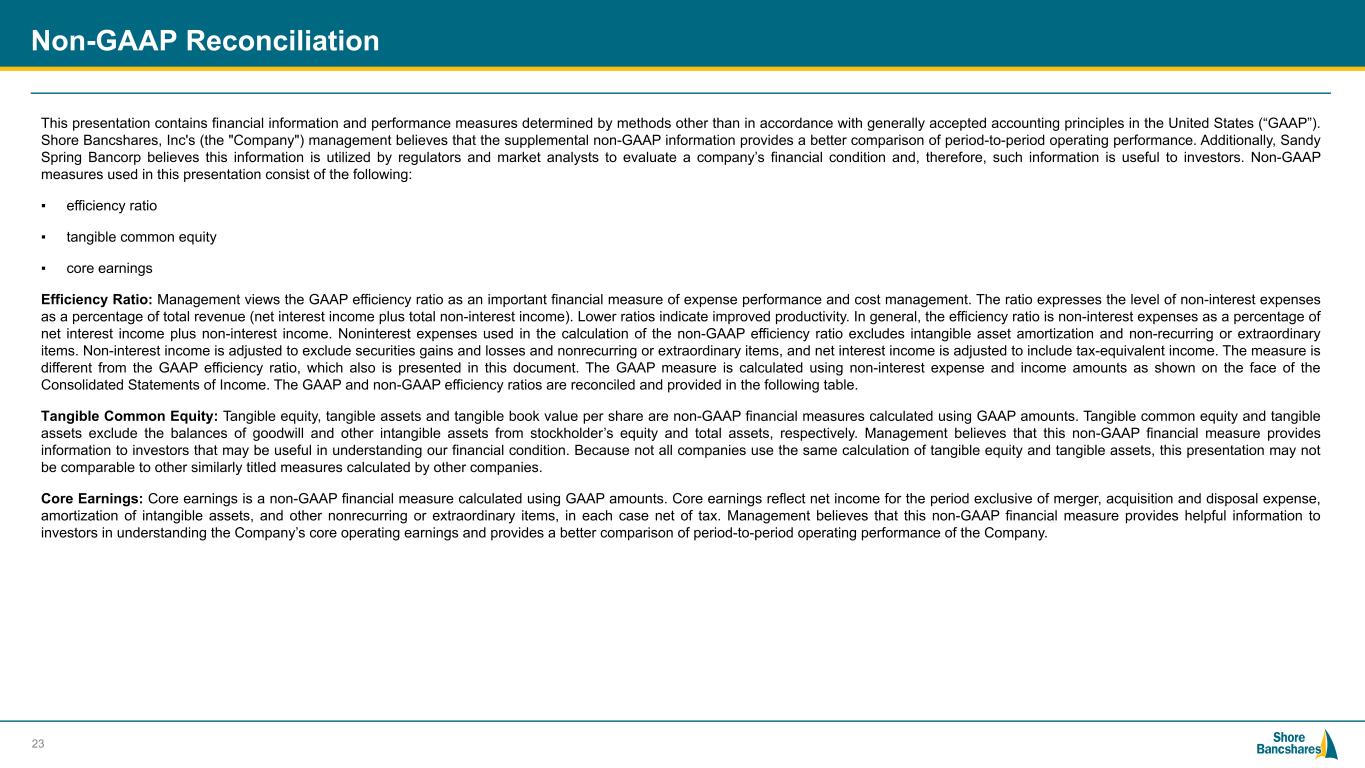 #006881 #ACC0C6 #83AFB4 #FEBE10 #5F574F #4D4F53 #C75B12 #5B8F22 #593160 Non-GAAP Reconciliation 23 This presentation contains financial information and performance measures determined by methods other than in accordance with generally accepted accounting principles in the United States (“GAAP”). Shore Bancshares, Inc's (the "Company") management believes that the supplemental non-GAAP information provides a better comparison of period-to-period operating performance. Additionally, Sandy Spring Bancorp believes this information is utilized by regulators and market analysts to evaluate a company’s financial condition and, therefore, such information is useful to investors. Non-GAAP measures used in this presentation consist of the following: ▪ efficiency ratio ▪ tangible common equity ▪ core earnings Efficiency Ratio: Management views the GAAP efficiency ratio as an important financial measure of expense performance and cost management. The ratio expresses the level of non-interest expenses as a percentage of total revenue (net interest income plus total non-interest income). Lower ratios indicate improved productivity. In general, the efficiency ratio is non-interest expenses as a percentage of net interest income plus non-interest income. Noninterest expenses used in the calculation of the non-GAAP efficiency ratio excludes intangible asset amortization and non-recurring or extraordinary items. Non-interest income is adjusted to exclude securities gains and losses and nonrecurring or extraordinary items, and net interest income is adjusted to include tax-equivalent income. The measure is different from the GAAP efficiency ratio, which also is presented in this document. The GAAP measure is calculated using non-interest expense and income amounts as shown on the face of the Consolidated Statements of Income. The GAAP and non-GAAP efficiency ratios are reconciled and provided in the following table. Tangible Common Equity: Tangible equity, tangible assets and tangible book value per share are non-GAAP financial measures calculated using GAAP amounts. Tangible common equity and tangible assets exclude the balances of goodwill and other intangible assets from stockholder’s equity and total assets, respectively. Management believes that this non-GAAP financial measure provides information to investors that may be useful in understanding our financial condition. Because not all companies use the same calculation of tangible equity and tangible assets, this presentation may not be comparable to other similarly titled measures calculated by other companies. Core Earnings: Core earnings is a non-GAAP financial measure calculated using GAAP amounts. Core earnings reflect net income for the period exclusive of merger, acquisition and disposal expense, amortization of intangible assets, and other nonrecurring or extraordinary items, in each case net of tax. Management believes that this non-GAAP financial measure provides helpful information to investors in understanding the Company’s core operating earnings and provides a better comparison of period-to-period operating performance of the Company.