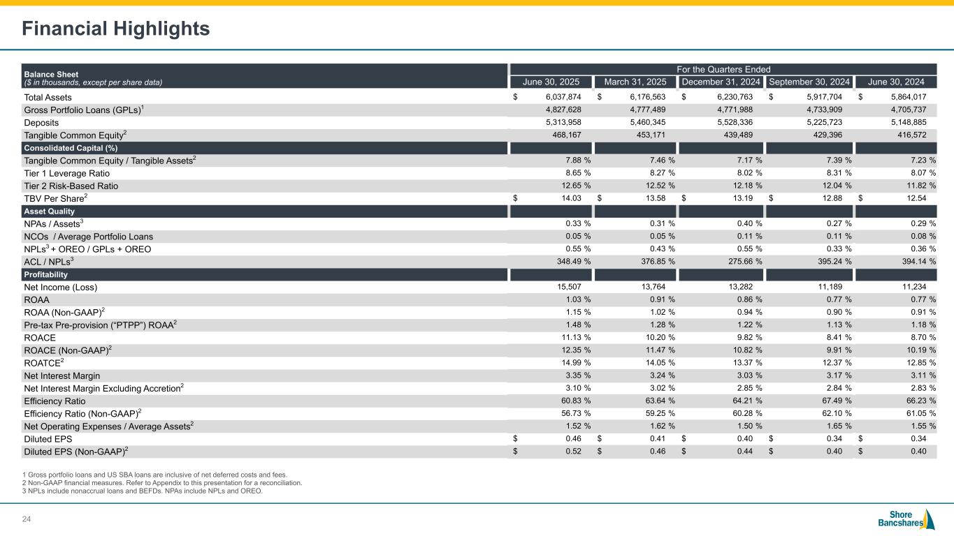 #006881 #ACC0C6 #83AFB4 #FEBE10 #5F574F #4D4F53 #C75B12 #5B8F22 #593160 Financial Highlights 1 Gross portfolio loans and US SBA loans are inclusive of net deferred costs and fees. 2 Non-GAAP financial measures. Refer to Appendix to this presentation for a reconciliation. 3 NPLs include nonaccrual loans and BEFDs. NPAs include NPLs and OREO. Balance Sheet ($ in thousands, except per share data) For the Quarters Ended June 30, 2025 March 31, 2025 December 31, 2024 September 30, 2024 June 30, 2024 Total Assets $ 6,037,874 $ 6,176,563 $ 6,230,763 $ 5,917,704 $ 5,864,017 Gross Portfolio Loans (GPLs)1 4,827,628 4,777,489 4,771,988 4,733,909 4,705,737 Deposits 5,313,958 5,460,345 5,528,336 5,225,723 5,148,885 Tangible Common Equity2 468,167 453,171 439,489 429,396 416,572 Consolidated Capital (%) Tangible Common Equity / Tangible Assets2 7.88 % 7.46 % 7.17 % 7.39 % 7.23 % Tier 1 Leverage Ratio 8.65 % 8.27 % 8.02 % 8.31 % 8.07 % Tier 2 Risk-Based Ratio 12.65 % 12.52 % 12.18 % 12.04 % 11.82 % TBV Per Share2 $ 14.03 $ 13.58 $ 13.19 $ 12.88 $ 12.54 Asset Quality NPAs / Assets3 0.33 % 0.31 % 0.40 % 0.27 % 0.29 % NCOs / Average Portfolio Loans 0.05 % 0.05 % 0.11 % 0.11 % 0.08 % NPLs3 + OREO / GPLs + OREO 0.55 % 0.43 % 0.55 % 0.33 % 0.36 % ACL / NPLs3 348.49 % 111.53 % 376.85 % 275.66 % 395.24 % 394.14 % Profitability Net Income (Loss) 15,507 13,764 13,282 11,189 11,234 ROAA 1.03 % 0.91 % 0.86 % 0.77 % 0.77 % ROAA (Non-GAAP)2 1.15 % 1.02 % 0.94 % 0.90 % 0.91 % Pre-tax Pre-provision (“PTPP”) ROAA2 1.48 % 1.28 % 1.22 % 1.13 % 1.18 % ROACE 11.13 % 10.20 % 9.82 % 8.41 % 8.70 % ROACE (Non-GAAP)2 12.35 % 11.47 % 10.82 % 9.91 % 10.19 % ROATCE2 14.99 % 14.05 % 13.37 % 12.37 % 12.85 % Net Interest Margin 3.35 % 3.24 % 3.03 % 3.17 % 3.11 % Net Interest Margin Excluding Accretion2 3.10 % 3.02 % 2.85 % 2.84 % 2.83 % Efficiency Ratio 60.83 % 63.64 % 64.21 % 67.49 % 66.23 % Efficiency Ratio (Non-GAAP)2 56.73 % 59.25 % 60.28 % 62.10 % 61.05 % Net Operating Expenses / Average Assets2 1.52 % 1.62 % 1.50 % 1.65 % 1.55 % Diluted EPS $ 0.46 $ 0.41 $ 0.40 $ 0.34 $ 0.34 Diluted EPS (Non-GAAP)2 $ 0.52 $ 0.46 $ 0.44 $ 0.40 $ 0.40 24