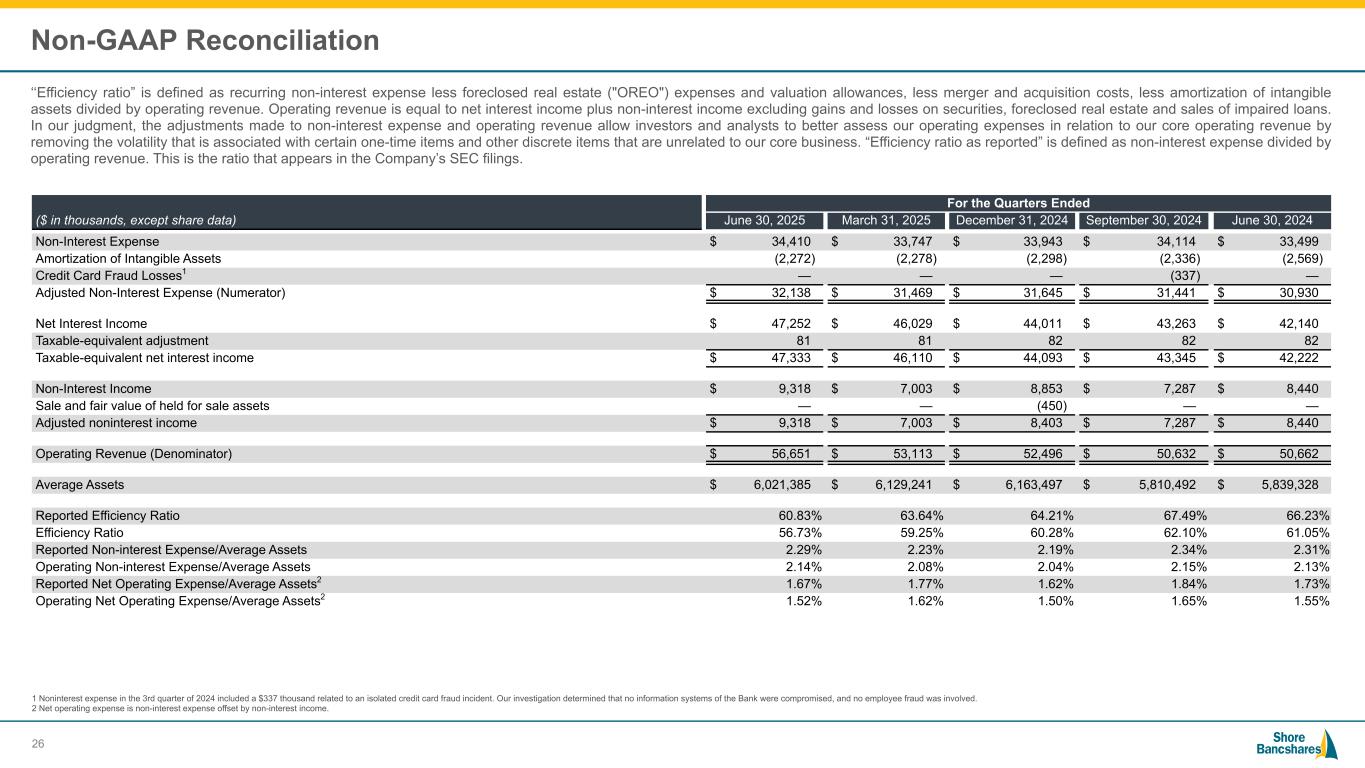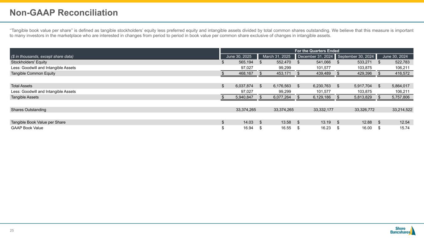 #006881 #ACC0C6 #83AFB4 #FEBE10 #5F574F #4D4F53 #C75B12 #5B8F22 #593160 Non-GAAP Reconciliation ‘‘Tangible book value per share’’ is defined as tangible stockholders’ equity less preferred equity and intangible assets divided by total common shares outstanding. We believe that this measure is important to many investors in the marketplace who are interested in changes from period to period in book value per common share exclusive of changes in intangible assets. ($ in thousands, except share data) For the Quarters Ended June 30, 2025 March 31, 2025 December 31, 2024 September 30, 2024 June 30, 2024 Stockholders' Equity $ 565,194 $ 552,470 $ 541,066 $ 533,271 $ 522,783 Less: Goodwill and Intangible Assets 97,027 99,299 101,577 103,875 106,211 Tangible Common Equity $ 468,167 $ 453,171 $ 439,489 $ 429,396 $ 416,572 Total Assets $ 6,037,874 $ 6,176,563 $ 6,230,763 $ 5,917,704 $ 5,864,017 Less: Goodwill and Intangible Assets 97,027 99,299 101,577 103,875 106,211 Tangible Assets $ 5,940,847 $ 6,077,264 $ 6,129,186 $ 5,813,829 $ 5,757,806 Shares Outstanding 33,374,265 33,374,265 33,332,177 33,326,772 33,214,522 Tangible Book Value per Share $ 14.03 $ 13.58 $ 13.19 $ 12.88 $ 12.54 GAAP Book Value $ 16.94 $ 16.55 $ 16.23 $ 16.00 $ 15.74 25